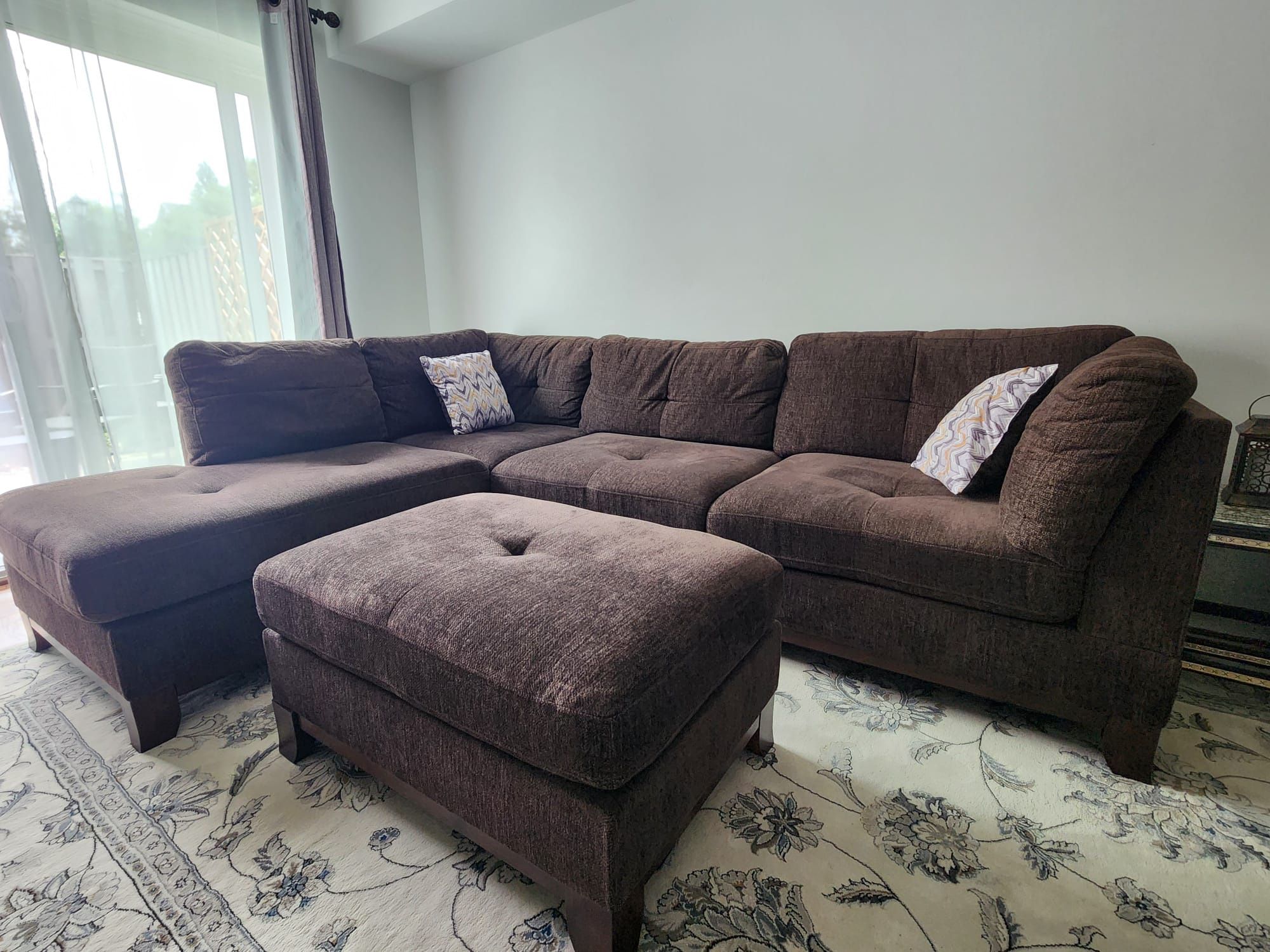 Use like new L shape sectional sofa couch with ottoman Sectional measures 105”x75”x35”H.