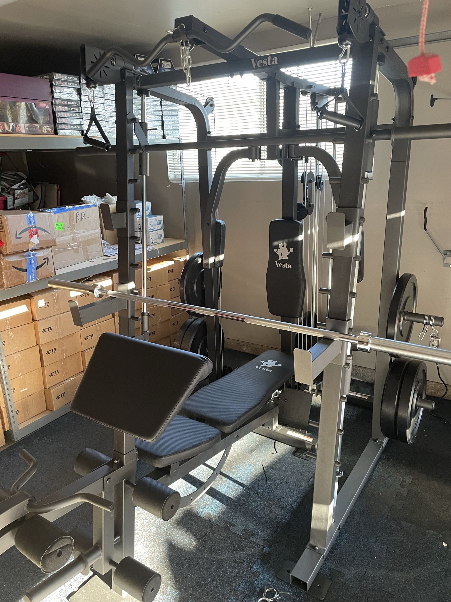 Vesta Fitness Smith Machine 2001 w/Bench Attachment | 230lb Bumpers Weights | 7ft Olympic Bar | Fitness | Gym Equipment | FREE DELIVERY 🚚