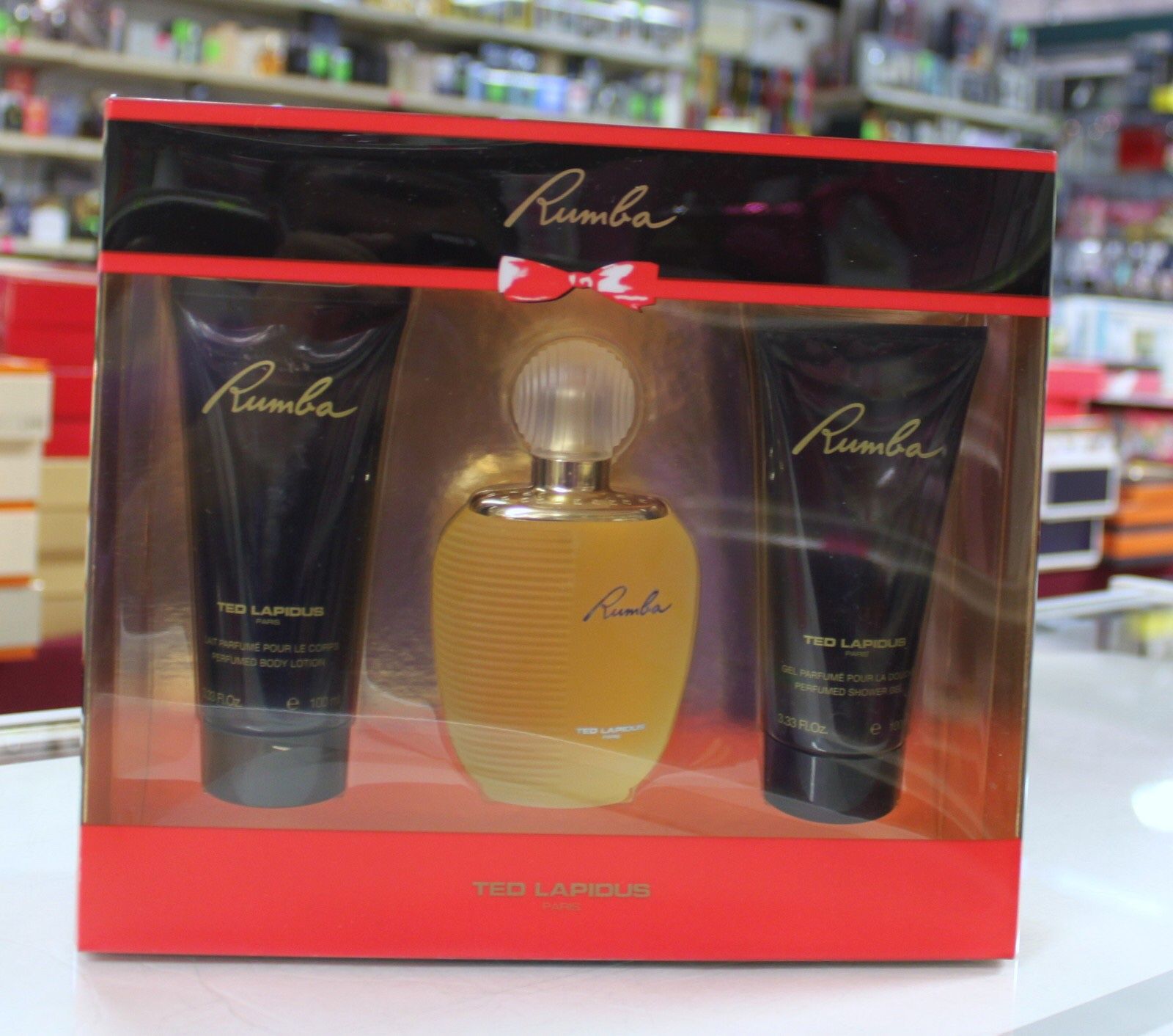 RUMBA by TED Lapidus 3PCS SET FOR WOMAN 3.33 FL.OZ / 100 ML EAU DE TOILETTE SPRAY + 3.3 FL.OZ/ 100 ML PERFUMED BODY LOTION + 3.3 FL.OZ/ 100 ML PERFUMED SHOWER GEL Soft plastic window display box Lotion may have changed formation