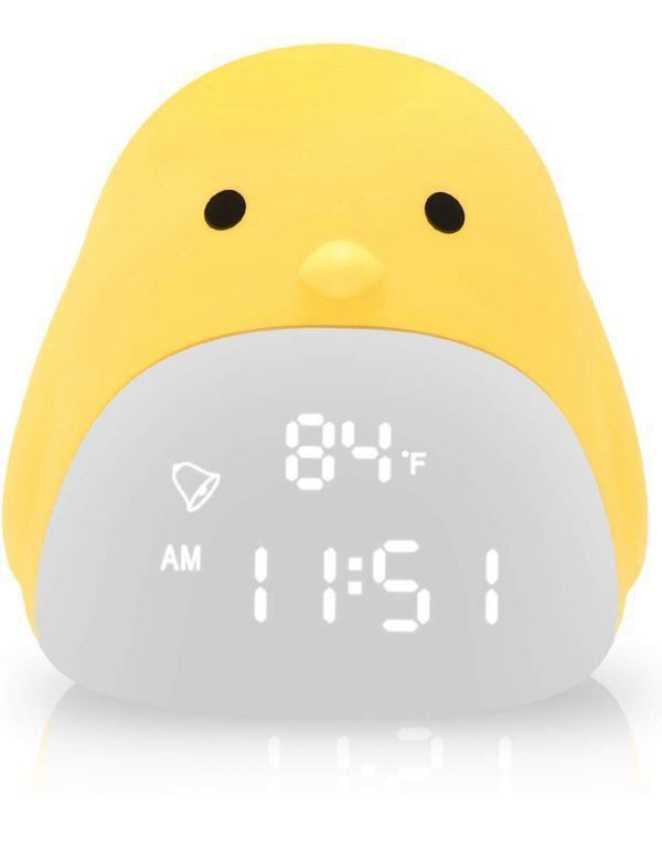 New in box [UNIQUE DESIGN]: material made of silicone, ABS, silicon the cartoon chick is comfortable to touch and stands out among the many alarm clocks. [FUNCTION]: 12/24 hour system,time, date,alarm clock (three sets of alarm clocks can be set),and can also set weekend alarm,temperature,screen brightness adjustment,two display modes [THREE LEVELS OF BRIGHTNESS]: you can set the night mode,when time runs the night mode.Three night light , brightness adjustable,Touch snooze. [BEST GIFTS]: Cute chick digital LED alarm clock for bedroom,not the traditional shape ,perfect for home decoration. It is best gifts for Kids.