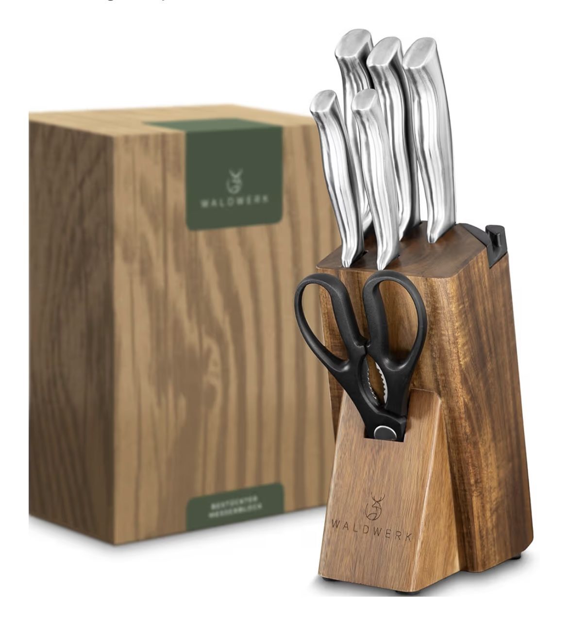 7 piece with block and integrated sharpener Stainless steel knives Solid acacia wood Retails for $70 our price $50 Can be purchased at Treasures Depot 9207 Broadway Ave Brookfield Illinois