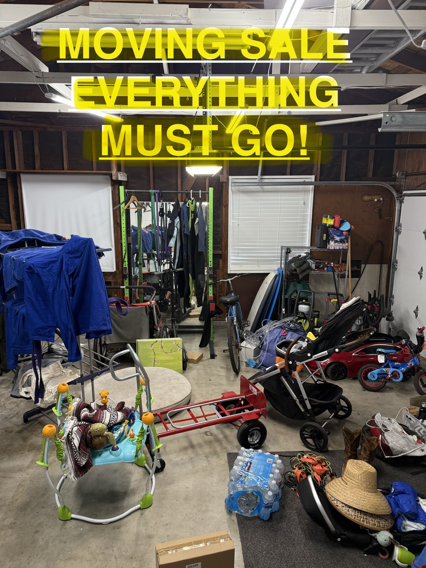 Check my page, lots going up for sale Electric scooter Tesla kid car Squat rack Hammock rack Boogie boards Power washer Shot back Surfboards Wetsuits Kid toys Beach toys Hit me up for offers!