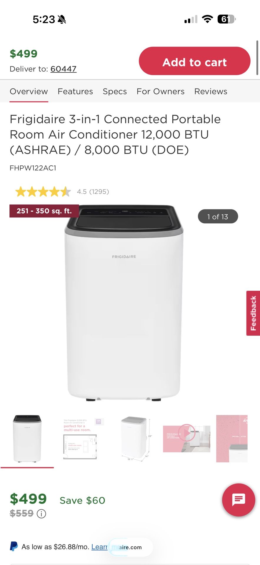 Frigidaire 3-in-1 Connected Portable Room Air Conditioner 12,000 BTU (ASHRAE) / 8,000 BTU (DOE) Used less than a year, moving to a place with central AC Bought for $500