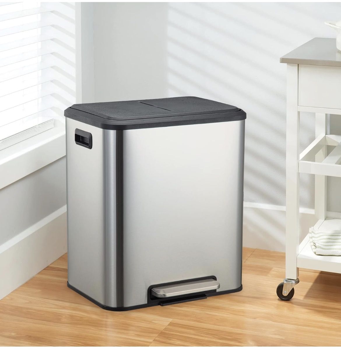 Kitchen Dual Trash Can and Recycling Bin, 2 x 4 Gallon Stainless Steel Trash Can, 30 Liter, Removable Inner Bin and Soft Close Lid, Suitable for Home, Office, Business - Silver Pn18-80
