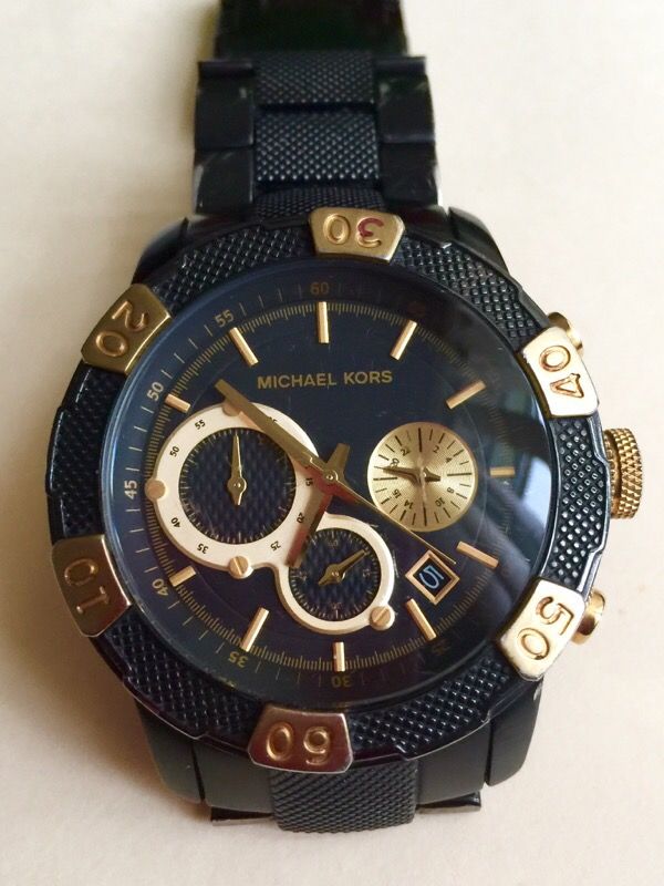 Authentic MK with battery. Its Black and Gold colors makes it stand out. It is water resistant with date and day. Also has 3 sub-dials and battery. Some fading on band but overall nice watch. For small wrist. No extra links.