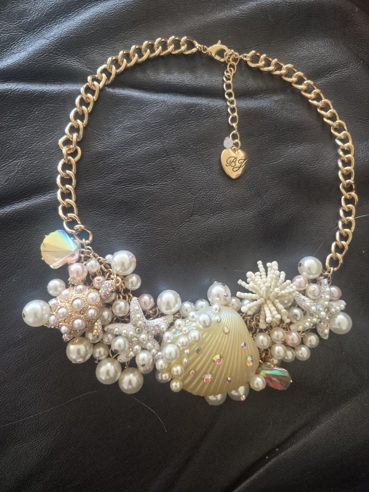 Gorgeous Betsey Johnson seashell and pearl statement necklace with plenty of bling! Sparkly rhinestones on the main seashell, sea turtle, and 2 starfish. Lots of pearls! Like new, never worn. Measures about 20" end to end.