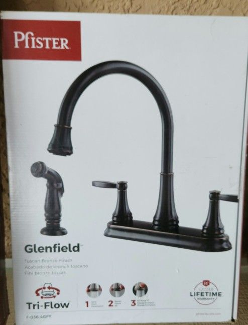 Pfister Glenfield Tuscan Bronze Double Handle High-arc Kitchen Faucet with Deck Plate and Side Spray Included. Like New. Asking $100 Thanks For Viewing. Take a Look at My Other Listings and Follow Me For The Best Deals and Prices.