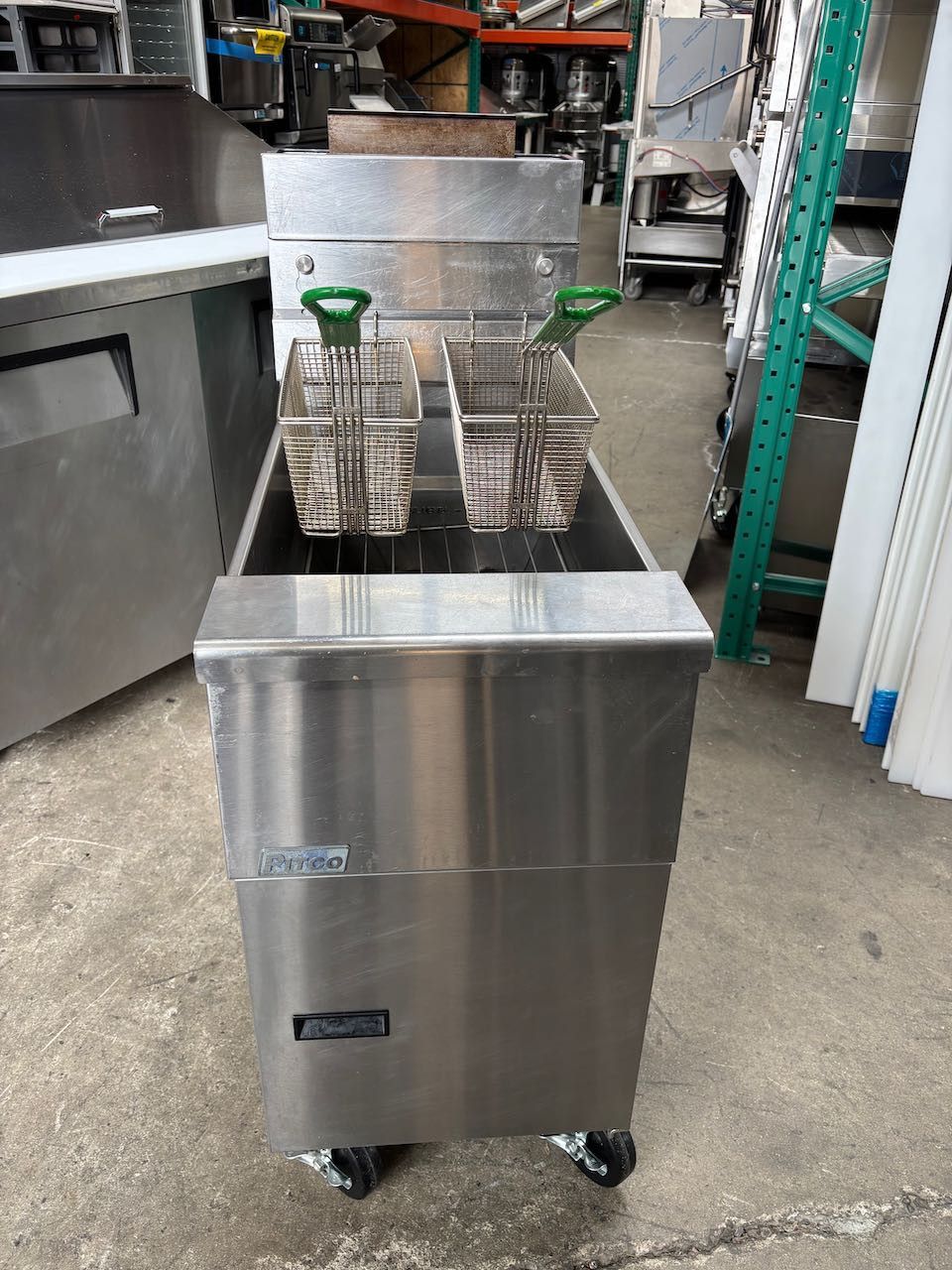 35/40LB Gas Deep Fryer Pitco VF35S High Efficiency 3 Burner Vat On Wheels #4570 Product Details 35-lb. oil capacity Operated with millivolt controls Temperature range: 200-400 degrees F Temperature-limit switch prevents dangerous levels Standing pilot light Gas control valve shuts off gas flow if pilot flame goes out 2 twin baskets with removable hangers Tank, front, door, and sides are stainless steel Tank has a smooth peened finish On Wheels 1 1⁄4-in. NPT drain valve Includes a drain extension and drain clean-out rod Recommended clearances: 6 in. floor, 6 in. sides and rear for combustible materials 70,000 BTU Dimensions & Utilities Cooking area: 14 in. L x 14 in. W x 2-3 1⁄2 in. D Overall: 15 5⁄8 in. W x 32 in. D x 47 1⁄4 in. H Powered by natural gas 3⁄4-in. NPT gas connection Pressure regulator included