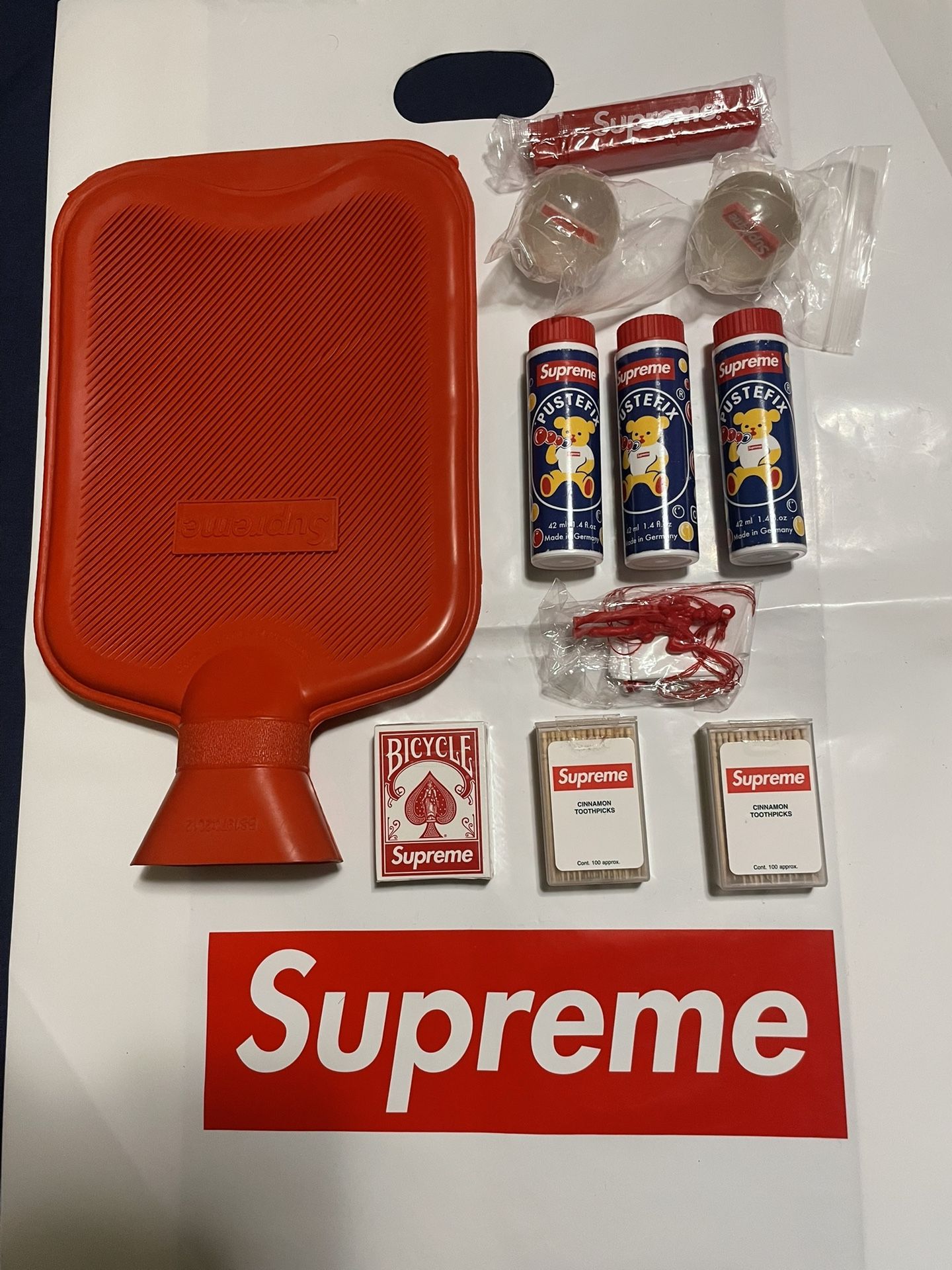 All from Supreme NYC Supreme bubbles $10 each Supreme mini card $15 each Hot water bottle $100 NWOT Supreme toothbrushes $20 each Supreme toothpicks ( SOLD OUT ) Supreme parachute man $15 each Supreme bouncy ball $10 each All available today only and up for sale COME CORRECT OR NOT AT ALL