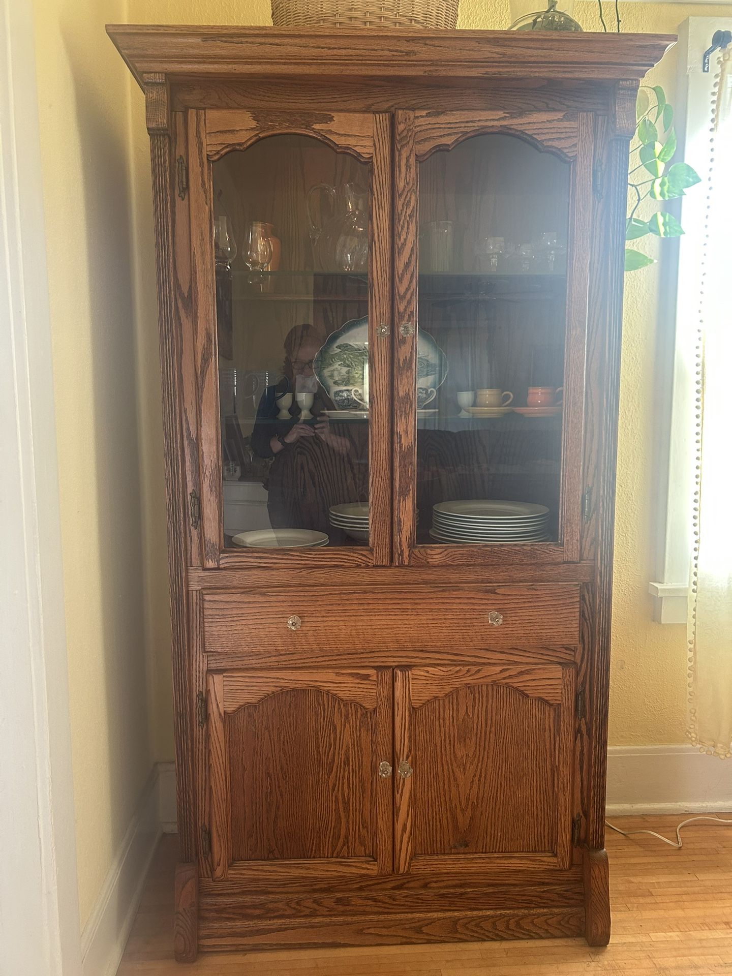 This is a real piece of grown up furniture. Real wood. Beautiful grain. Glass knobs. Glass shelves. 75” tall 37.5” across 17” deep. Pick up in NE Portland. Free if you take it today!