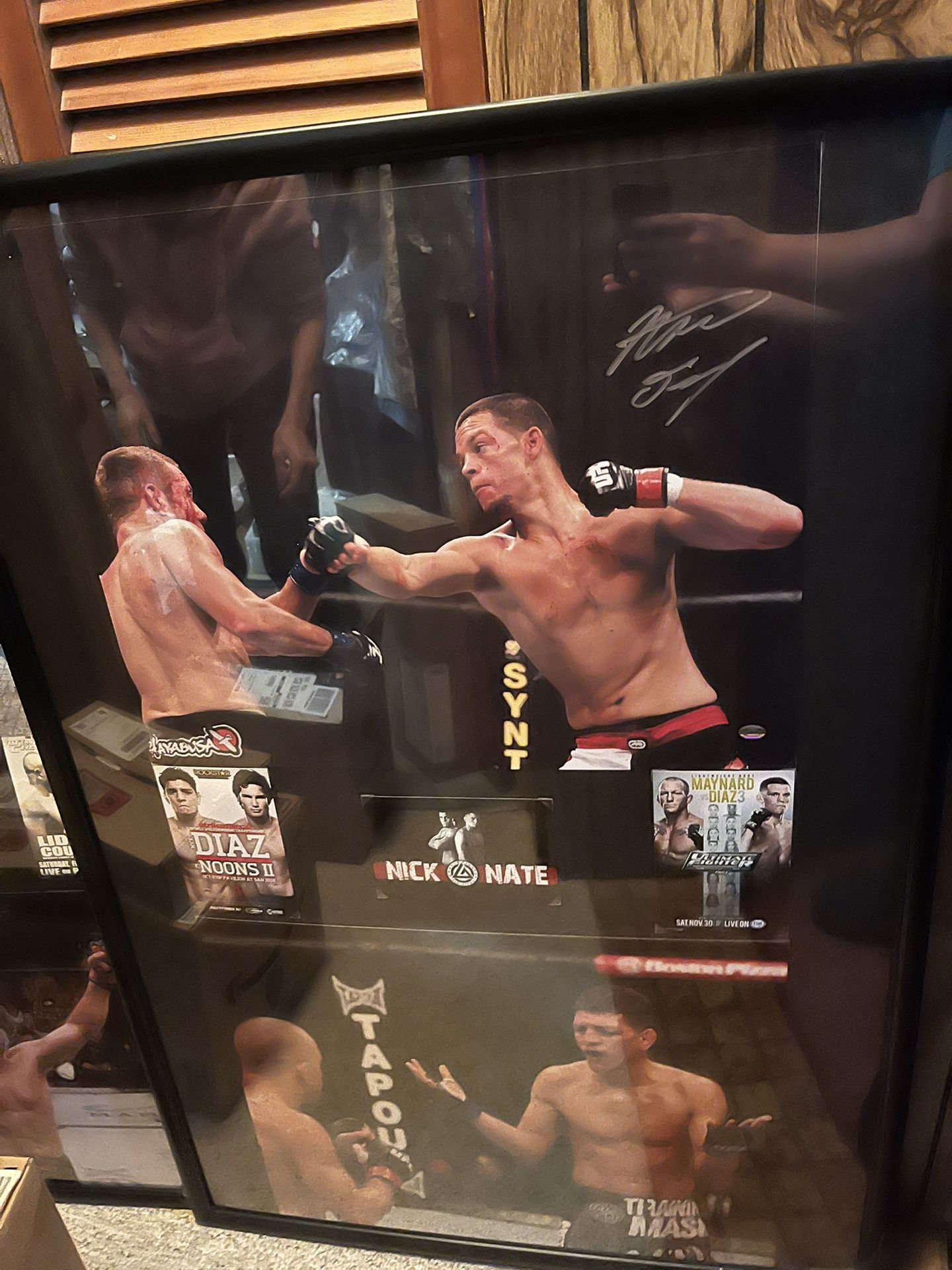 27x40 framed display of 16x20 photos signed by former UFC fighters and brothers Nick & Nate Diaz. $225 or best offer. Cash, Venmo or PayPal is accepted.