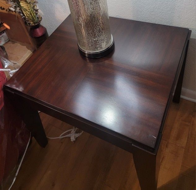 Cassara Cherry table set. Two end tables, big coffee table have wheels on the bottom of it. There are brand new, bought them and didn't fit. Bring help, for I can't lift. The dimensions are for cocktail table (big coffee table) 50"l x 28"w x 18"h, The end tables each dimension is 24"l x 22"w x 24"h.the side table isn't damaged that's the light reflection on it.