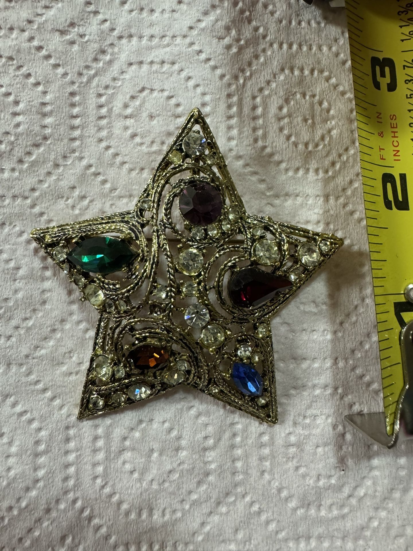 LA ROCO. BROOCH. PIN. CAN BE HUNG ON NECKLACE. DOMED. RHINESTONES. 1(contact info removed)'s. APPROXIMATELY 2.5/8" PICTURE DOES NOT SHOW HOW PRETTY IT IS. PICK UP IN SAN BERNARDINO. ON 5TH ST AT E ST. OFF 215. Ear box