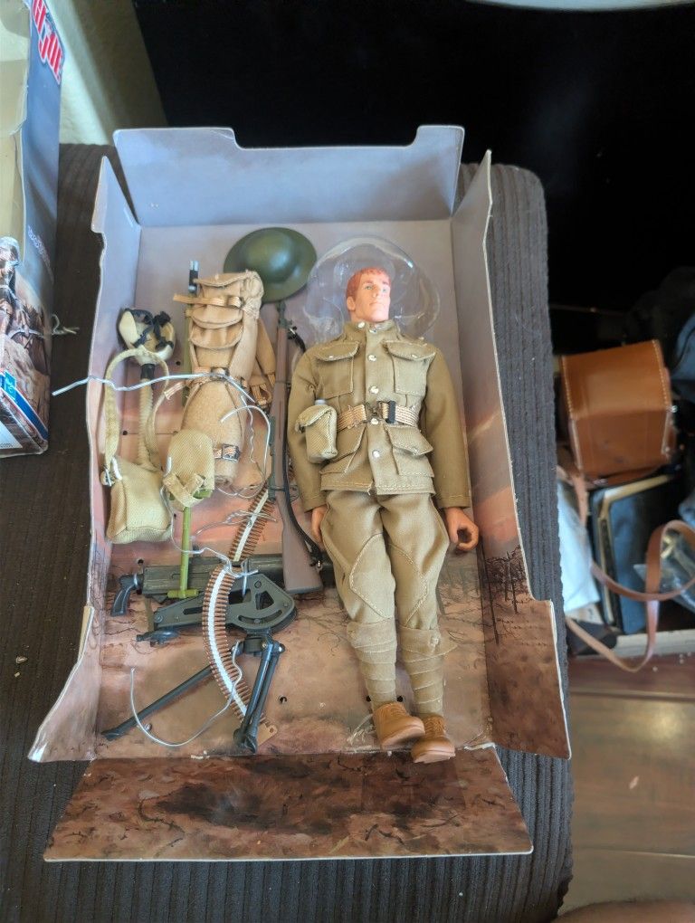 GI Joe World War I Doughboy 12-inch action figure by Hasbro (1999). Figure is complete with all original accessories: WWI uniform Helmet Backpack and gear Machine gun with ammo belt Accessories shown in photos Figure itself is in very good condition and was carefully removed from the box. Original box and inner tray included, but box has noticeable wear, creases, and damage. Please see photos. Great display piece for GI Joe or military collectors.