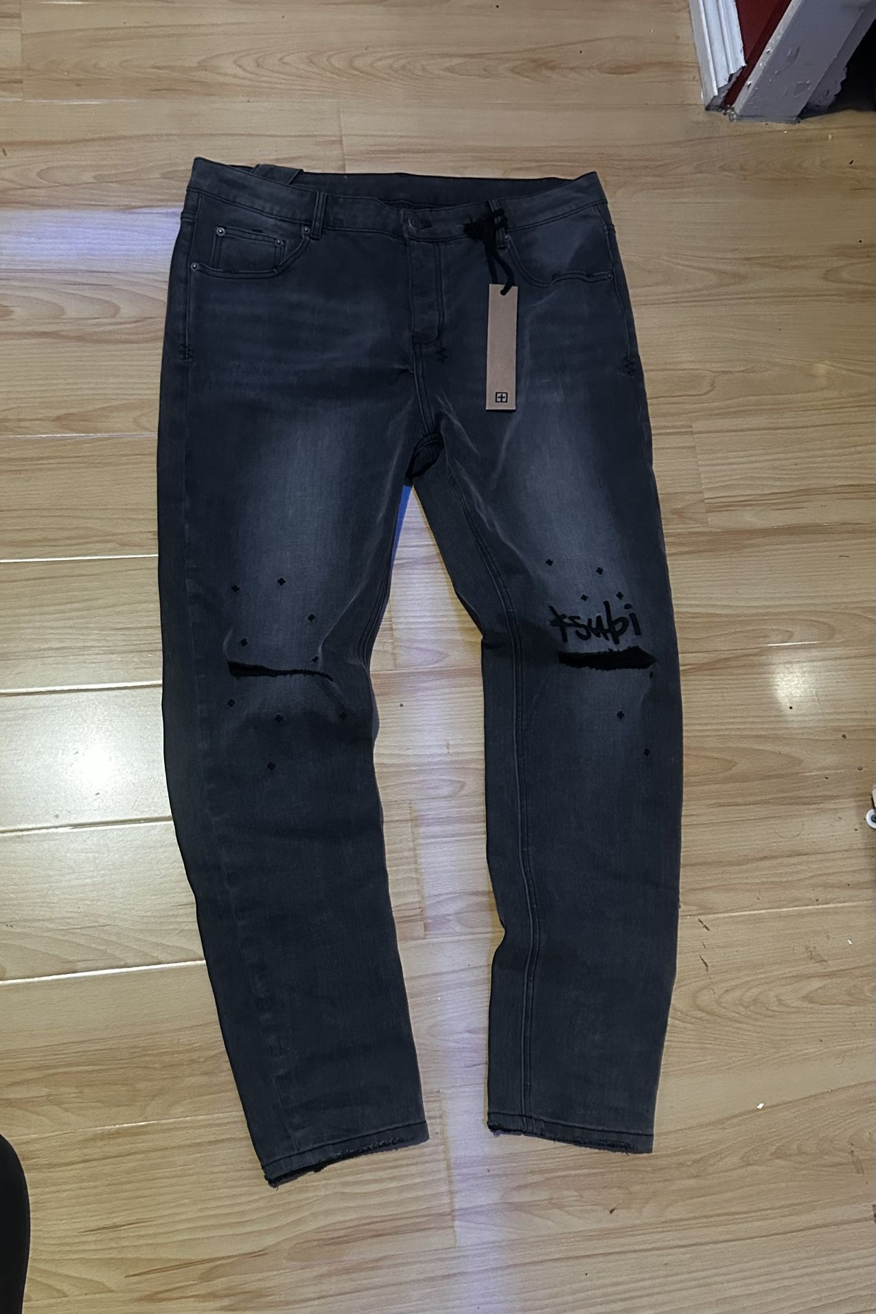 KSUBI Jeans Sz 34 Skinny Jeans Greyish Black ish colorway says ksubi on top of the rip on the knee the ksubi is embroidered also has + around it and has the + on the other leg.Still New condition worn about twice max no stains also has the back hang tag. Does not include the brown hang tag on front thats on the picture!.