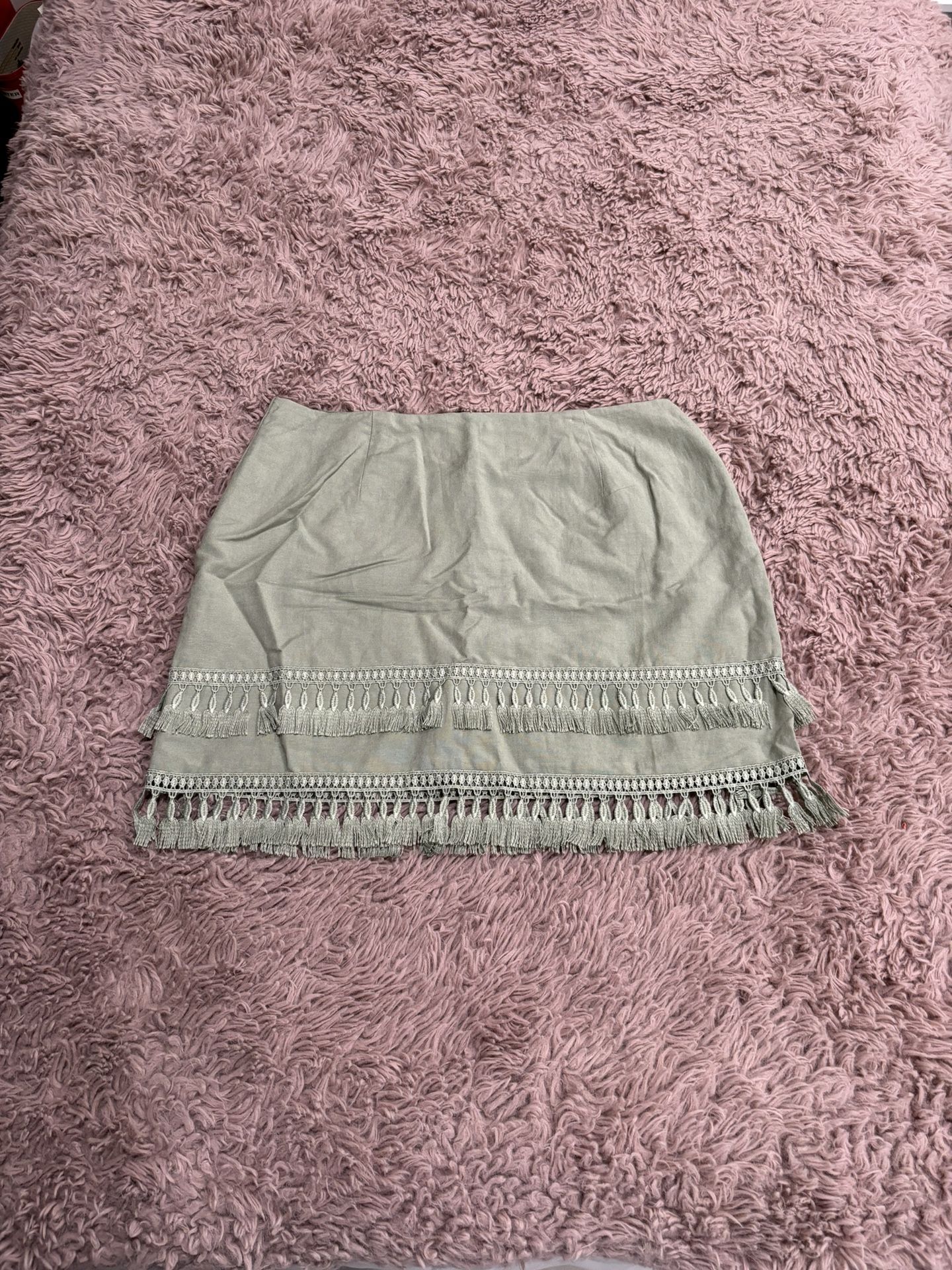 Like new condition - Lulu’s Women Tassel Mini Skirt In Sage Green Lulus Exclusive! Step up your skirt game with the Lulus Sekera Sage Green Tassel Mini Skirt! A high, fitted and darted waist flows seamlessly into a cute A-line mini skirt. Double tassel trim adds the perfect amount of flirty and femme vibes to this linen-like woven piece. Hidden clasp/zipper at back. Women size M