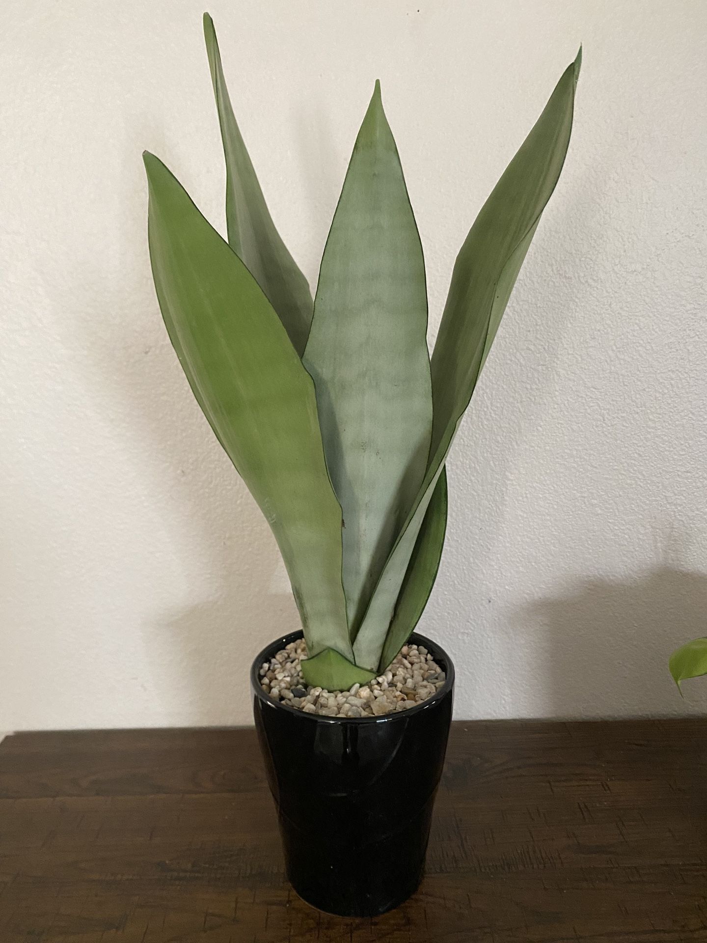 Sansevieria Moonshine in black ceramic pot. Has very broad leaves.