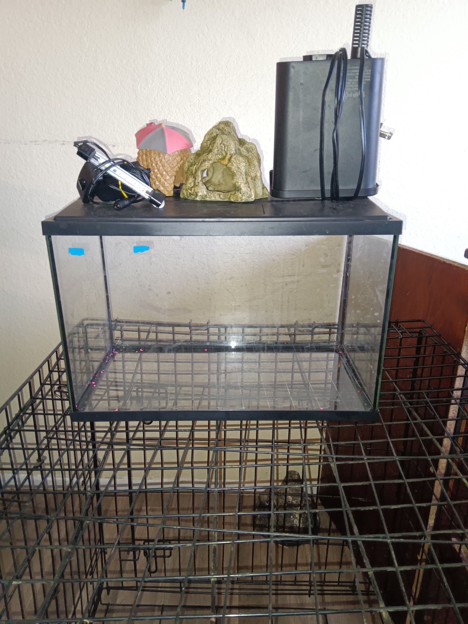 Only used it for like a week or so it’s has lights, water pump and one filter. I do have a bit of decor that can go along with fish tank price is only for tank not decor that will be added if interested.