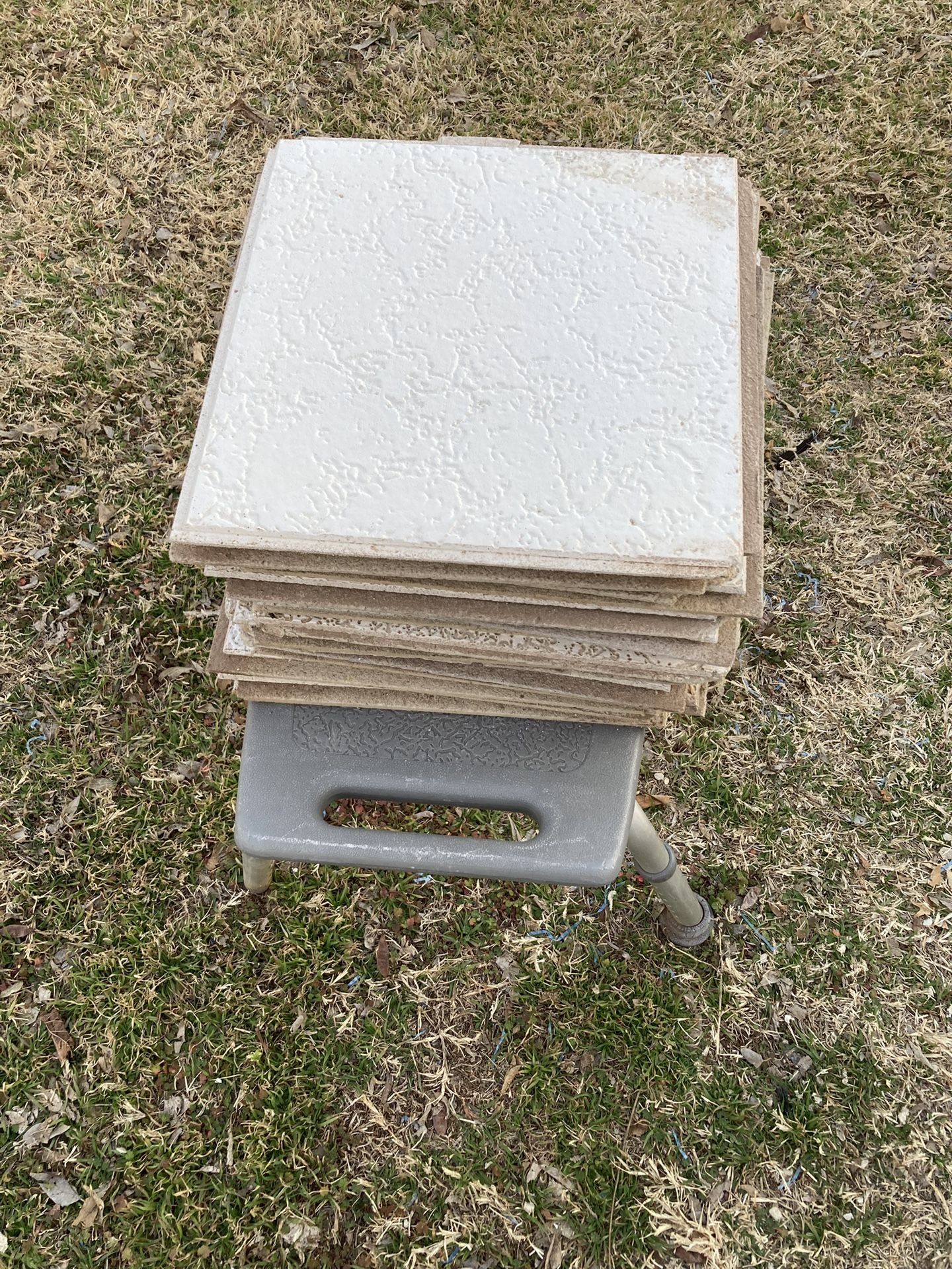 In this lot I have a total of 84 clip up or glue up ceiling tiles, never used. 81 of them are square & measure 1 FOOT X 1 FOOT all around. 3 of them are rectangular with dimensions 1 FOOT X 9.5 INCHES. These ceiling tiles offer a traditional heavily textured ceiling visual. They’re heavily textured tile · Great for covering damaged drywall, plaster or popcorn ceilings. Some of the tiles have dirt on them since they’ve been stored for awhile in the shed/s. EACH TILE IS $1. MINIMUM $10 purchase please. Price is negotiable. Any questions please ask. Wiling to ship also.