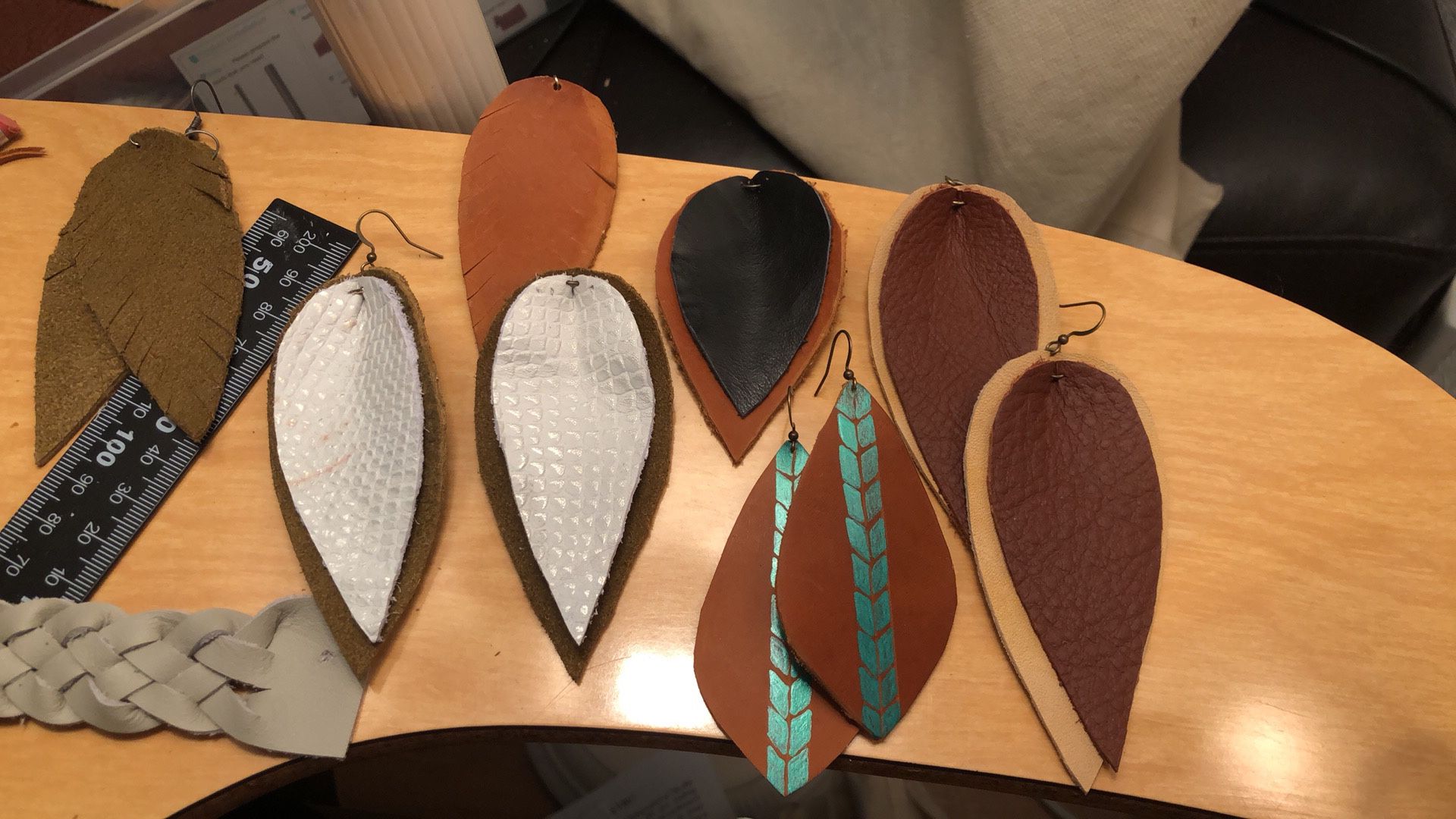 Leather Earrings and bracelets, prices vary by style from $13 to $20.