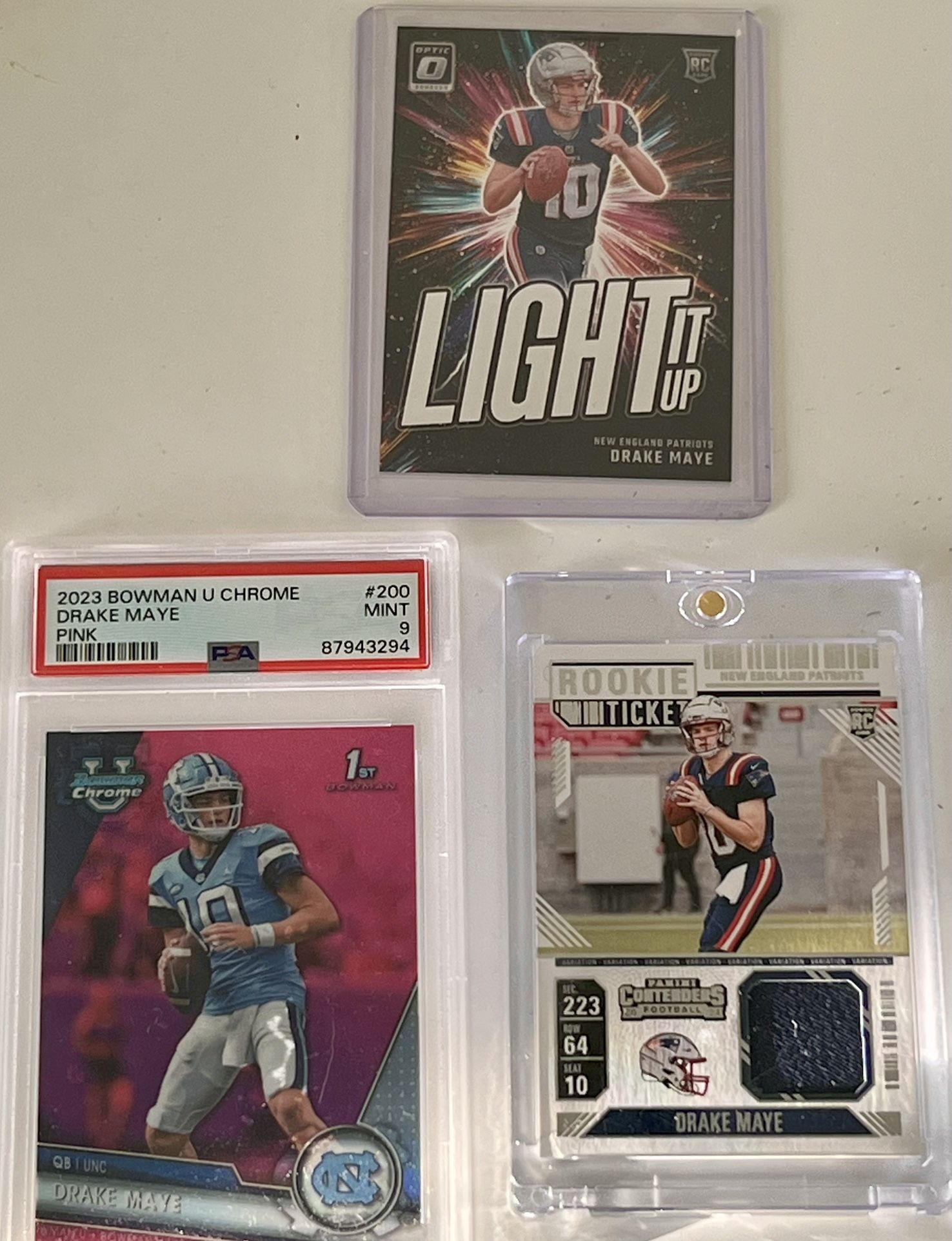 Selling Three Drake Maye Carda buy all 3 for $100 and save $10 buyin each and I'm throwing in the Get It Out RC !