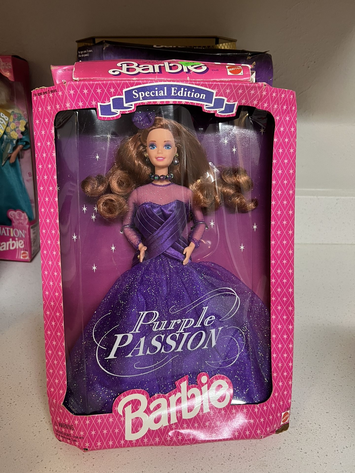 Mattel Special Edition Purple Passion Barbie doll, released in 1995. The doll has auburn hair and blue eyes. It is a fashion doll wearing a shimmeri