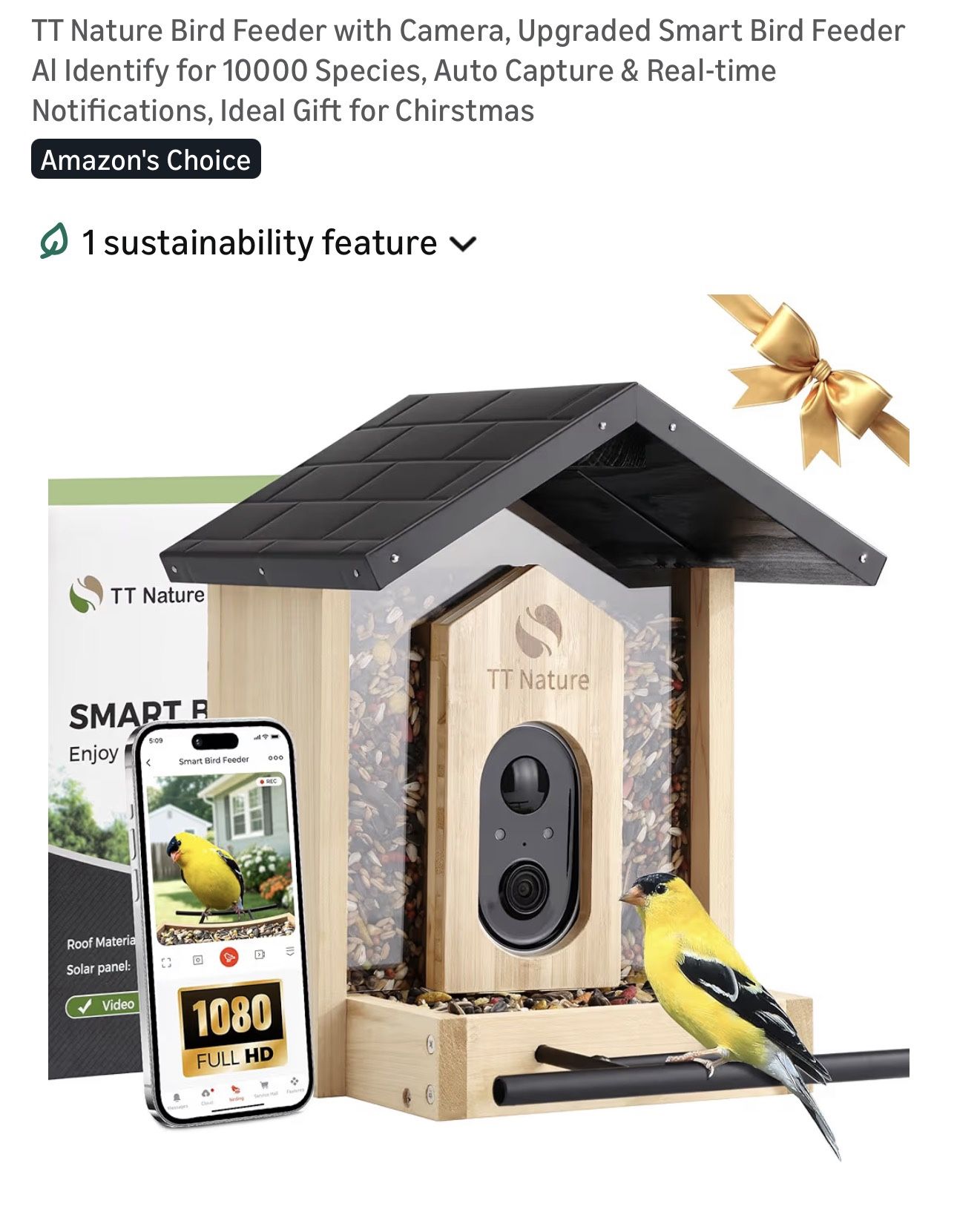 Enhanced Bird Watching Experience Enjoy birdwatching like never before! Our smart bird feeder with camera sends real-time notifications straight to your phone, allowing you to capture every feathered visitor with ease—no binoculars needed. Record, replay, and immerse yourself in nature anytime. Advanced Camera Technology Equipped with 1080P HD resolution, night vision, and an ultra-wide-angle lens, this bird feeder delivers crystal-clear images day and night. With a rapid 0.5s motion detection and built-in AI bird recognition, you’ll never miss a moment while attracting more birds to your yard. Premium Eco-Friendly Design Crafted from high-quality natural wood, this bird feeder offers exceptional durability and rustic charm. The eco-friendly materials make it a sustainable choice for nature lovers. Easy to install with multiple mounting options, and backed by a lifetime guarantee—perfect for gifting. Cloud Storage & Multi-Device Sharing Save memorable bird videos securely in the cloud and share them with family and friends. Support for multi-user access allows everyone to enjoy live viewing at the same time, making it fun, interactive, and ideal for group birdwatching. Perfect Christmas Gift Delight nature enthusiasts of all ages with the TT Nature Smart Bird Feeder with Camera—a thoughtful and festive gift that brings joy, discovery, and a closer connection to the outdoors.