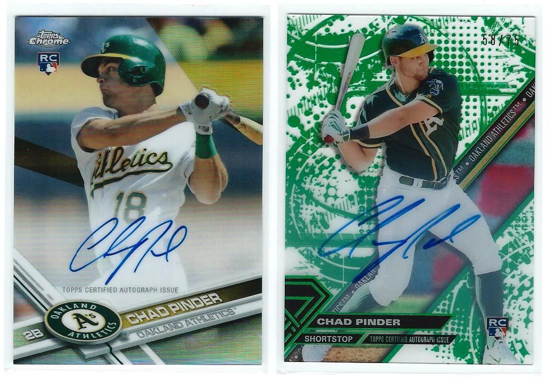 $20 FIRM for all eight cards (8) CHAD PINDER Oakland Athletics Topps Bowman Chrome REFRACTOR prospect serial numbered colored parallel rookie baseball cards. They are: 1) 2017 Topps Chrome "REFRACTOR" on-card AUTOGRAPH RC #130/499 1) '17 Topps High Tek "GREEN RAINBOW" on card AUTO #58/75 1) 2014 "GREEN REFRACTOR" #47/75 1) 2015 "GREEN REFRACTOR" #32/99 1) 2016 Bow Chrome "GREEN REFRACTOR" #57/99 1) '16 BC "GREEN SHIMMER REFRACTOR" #60/99 2) '15 BC Prospects "REFRACTORS" #/499 These A's RC cards are in protective softie/penny sleeves and toploaders and are in mint condition; great addition to any collection Will trade for junk silver coins Please message me with any questions you may have. I meet up at the QuikTrip in Gladstone at 169 and 68th St; thank you