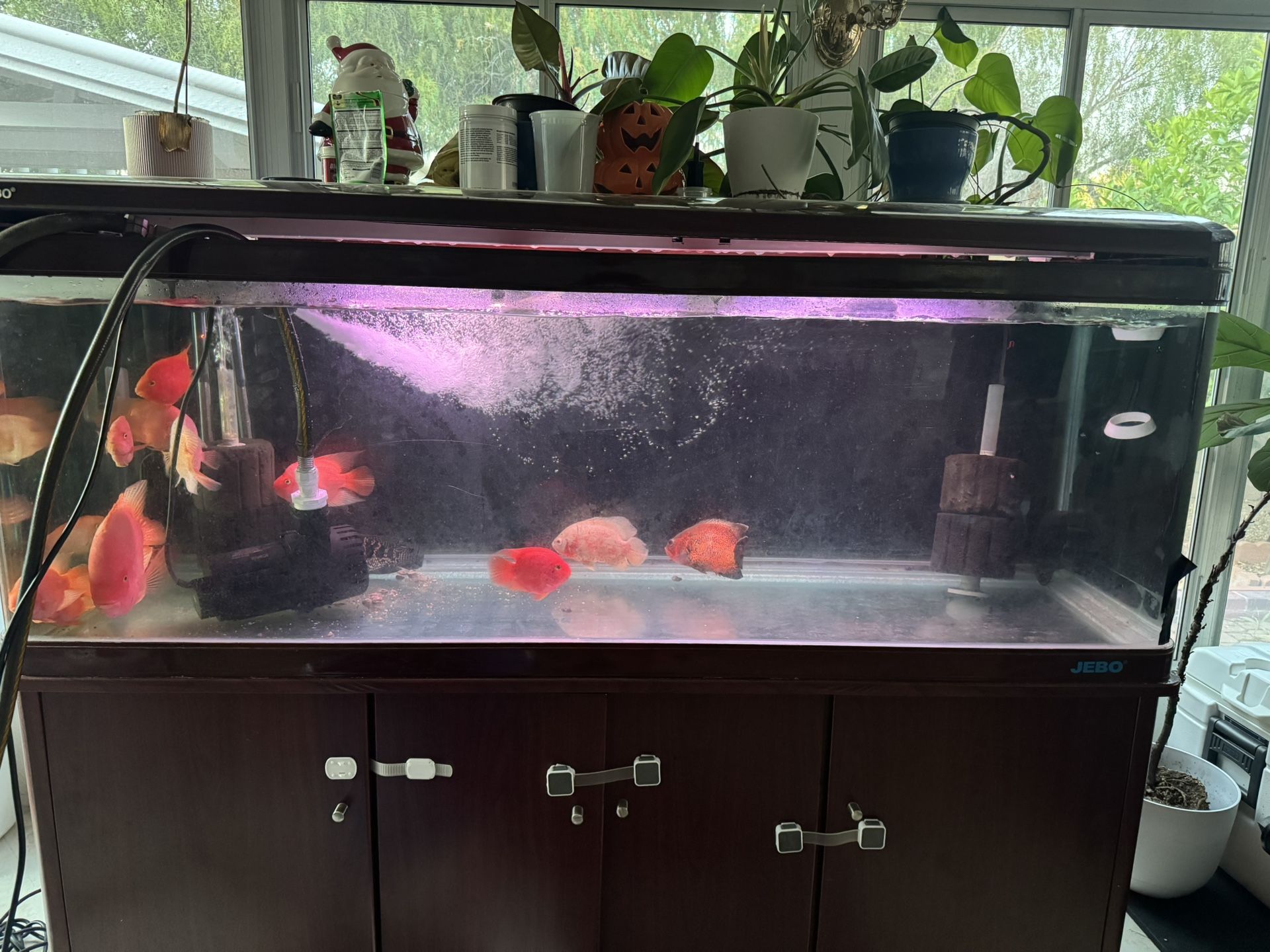 180-Gallon Aquarium Setup – Serious Filtration & Heating Selling a 180-gallon fish tank with high-quality equipment. Ideal for large freshwater fish, cichlids, or monster setups. Included: • 180-gallon glass aquarium • Fluval FX6 canister filter (rated for large tanks, excellent flow) • 2× Eheim heaters (reliable, industry standard) • 1× Fluval heater (backup or supplemental heating) • Tetra Whisper air pump, rated for up to 300 gallons (strong aeration)