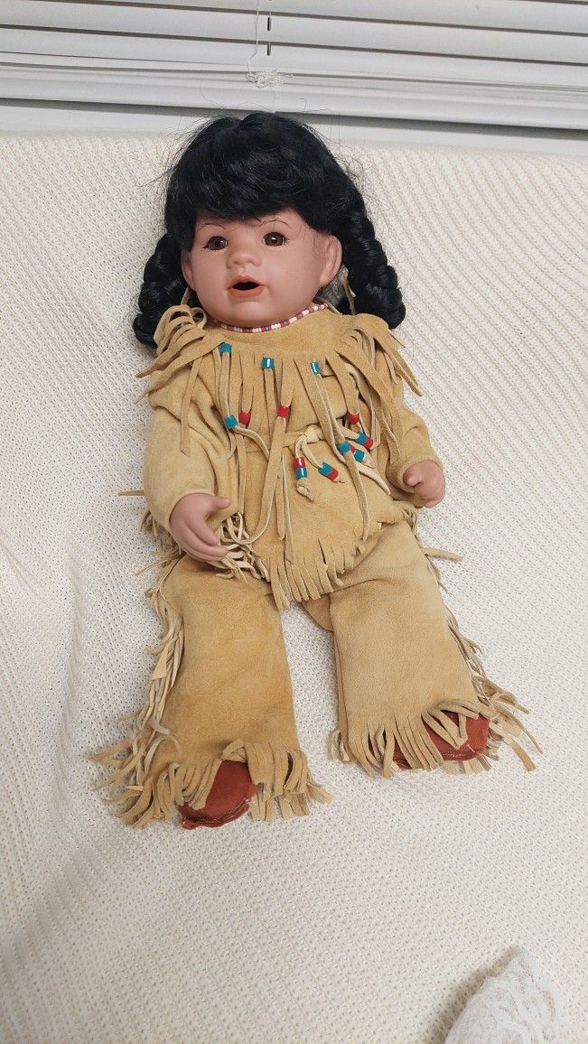 Handmade one of a kind... native baby girl in Handmade authentic outfit beautiful materials and beading. Soft Bodied. Weighted. Porcelain boots tyner original model kit "gumdrop" head.