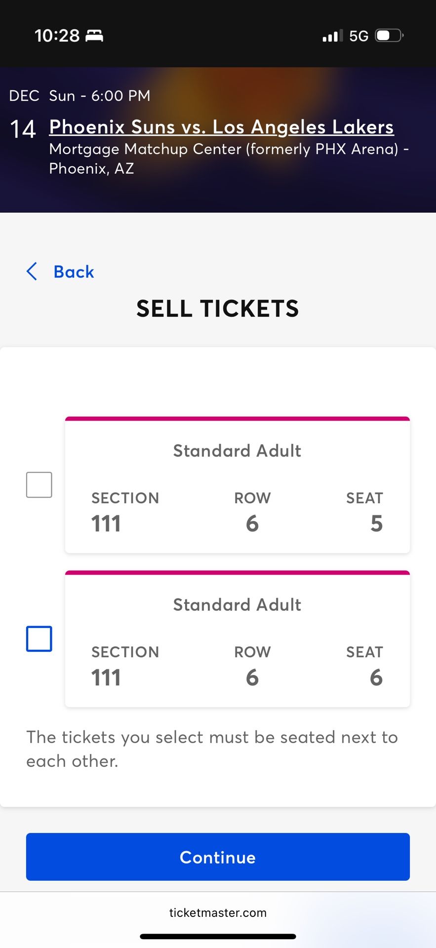 Phoenix Suns vs. Los Angeles Lakers π Sun, Dec 14 β 6:00 PM π Footprint Center (Phoenix) Price starts at $298 per seat/ticket β already priced at heavily discounted rates compared to what these LL seats usually go for Two LOWER LEVEL pairs available (seats together in each pair): 1. Section 111, Row 6, Seats 5β6 β $328 per ticket ($656 for the pair) 2. Section 112, Row 10, Seats 17β18 β $298 per ticket ($596 for the pair) β Mobile transfer (Ticketmaster) β Selling as pairs only (seats are next to each other) π³ Payment: Zelle/Venmo/cash We got these to gift for friends and family. Unfortunately, they are out of town and wonβt make the game. Serious buyers onlyβ include your seats of choice when you message me!
