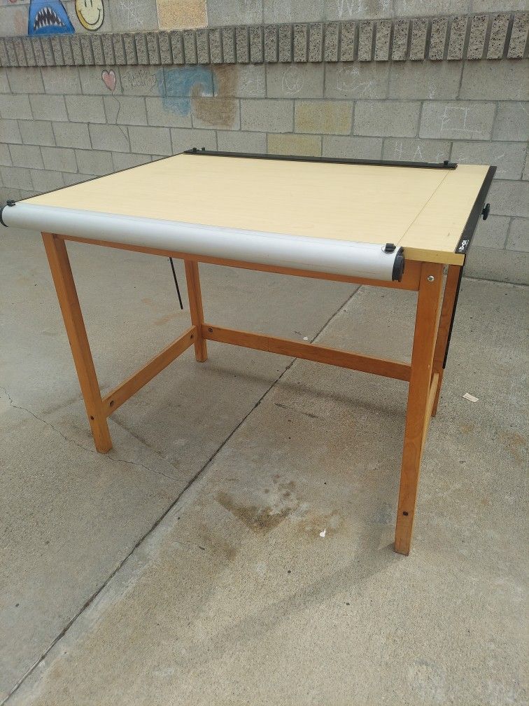 Drafting table, can be inclined, rolling tube paper holder, sliding straight edge, has storage space underneath. Table top dimensions 48x 37 inches. Table height 37 inches. Asking $100 o.b.o.