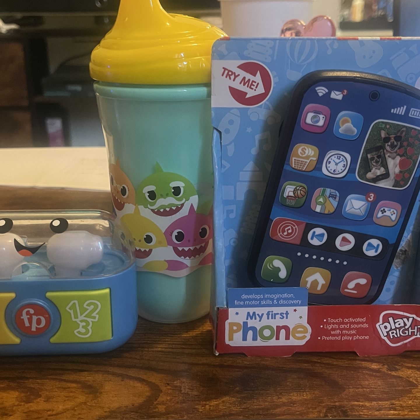 My first phone U play ear buds Baby Shark sippy cup Brand new still sealed