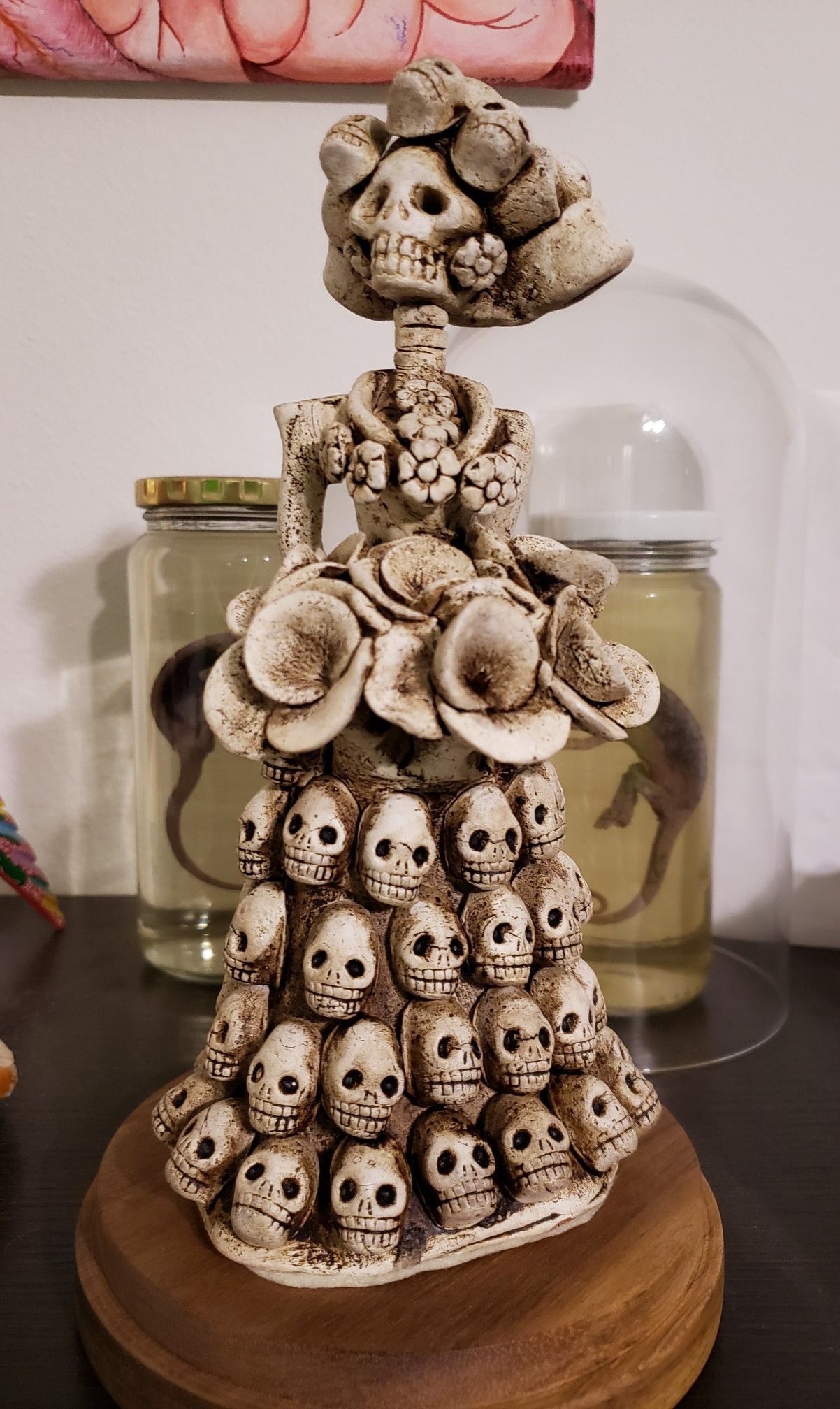 Exquisite and Outstanding piece of Art.... The Attention to detail and impressive workmanship is being showcase with multiple Skulls placed on her dress creating an unbelievable pattern that will catch everyone's attention... Handmade clay sculpture... Day of the Death CATRINA... Includes Glass dome to protect this piece of Art.... 10 Inches tall....