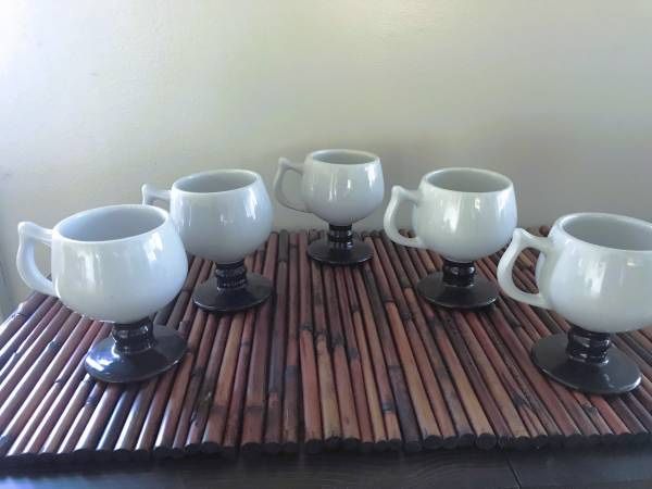 Vintage Mid Century Modern Puerto Rico Caribe China Footed Coffee Mugs Cups Restaurant Ware- Set of 5 for $45. Pedestal Hotel Coffee Mugs made in Puerto Rico perfect for coffee drinks. Dark brown and white china in excellent condition and made for restaurant / bar use. 4 1/2" tall