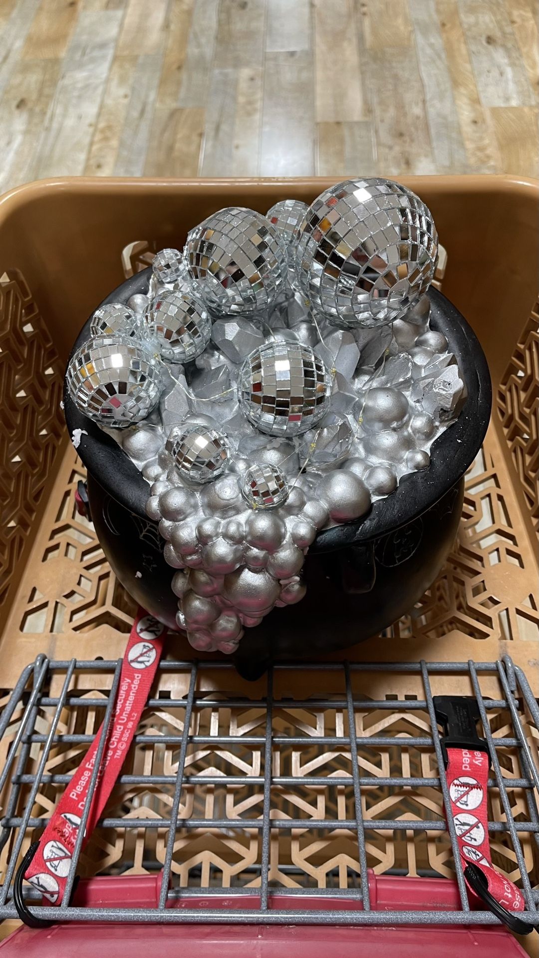 Designer Disco Ball Cauldron with fairy lights attached in the bubbles. New without tags. 3 new AAA batteries in it. Has some weight to it!