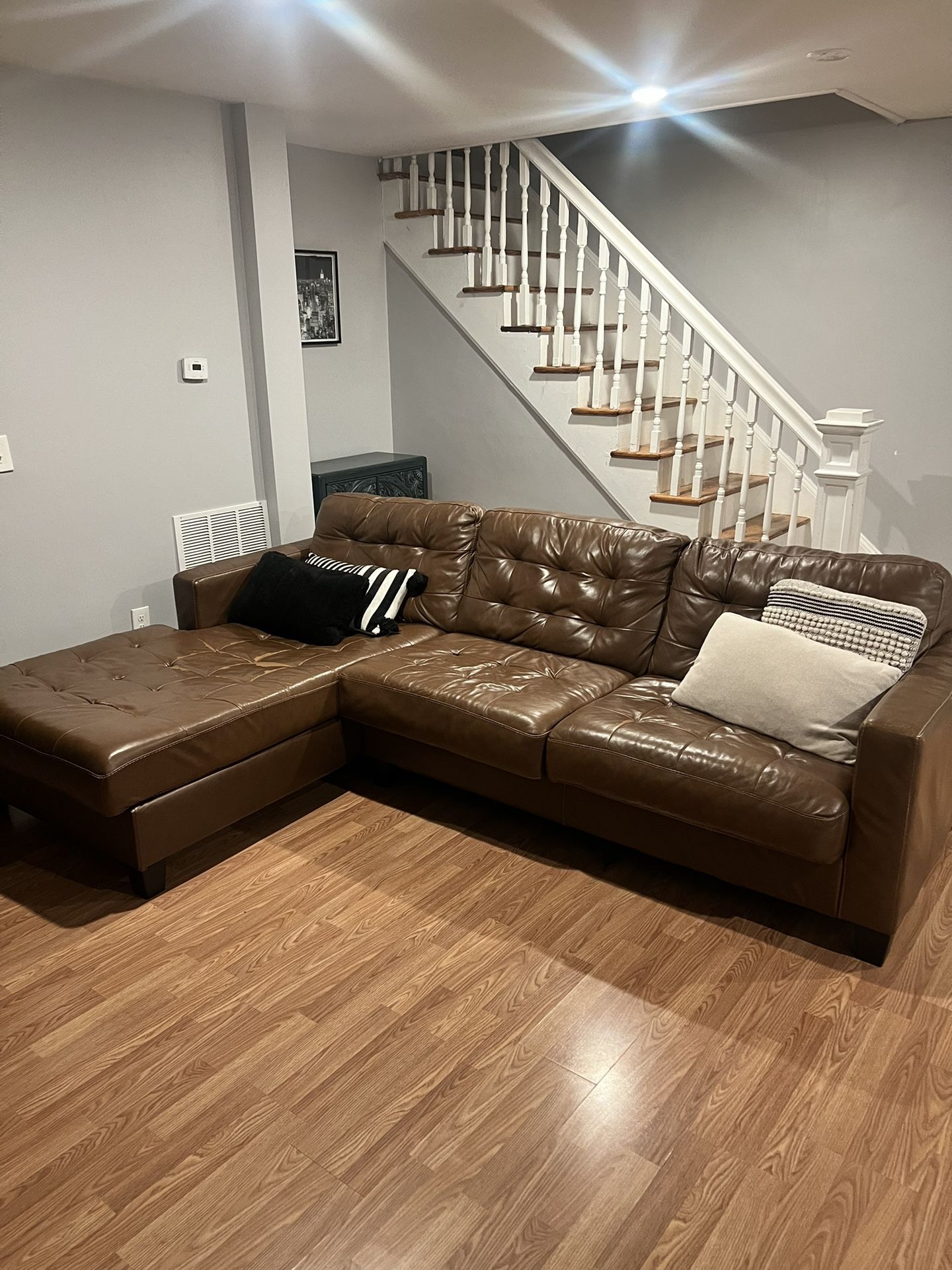 My dad bought this couch years ago so it was very well used as you can see. The leather is all scratched up because of the dog and I also believe its broken somewhere but I couldnt get a picture. Im not gonna lie it isnt in its best condition but hey man its a 2,200k couch for free lol