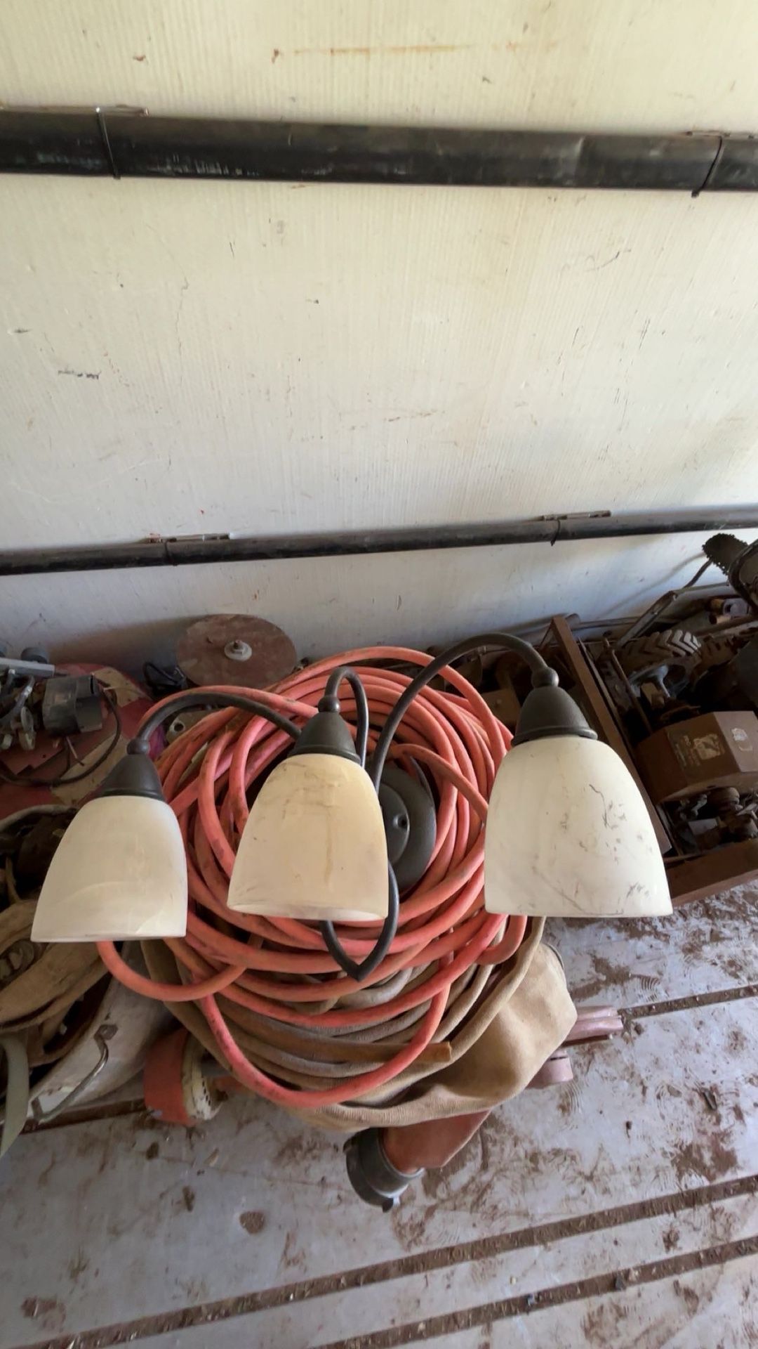 Classic 3 light fixture. Has frosted glass bell shades and a dark metal frame. Good for a bathroom vanity or hallway. Just needs a little wipe down.
