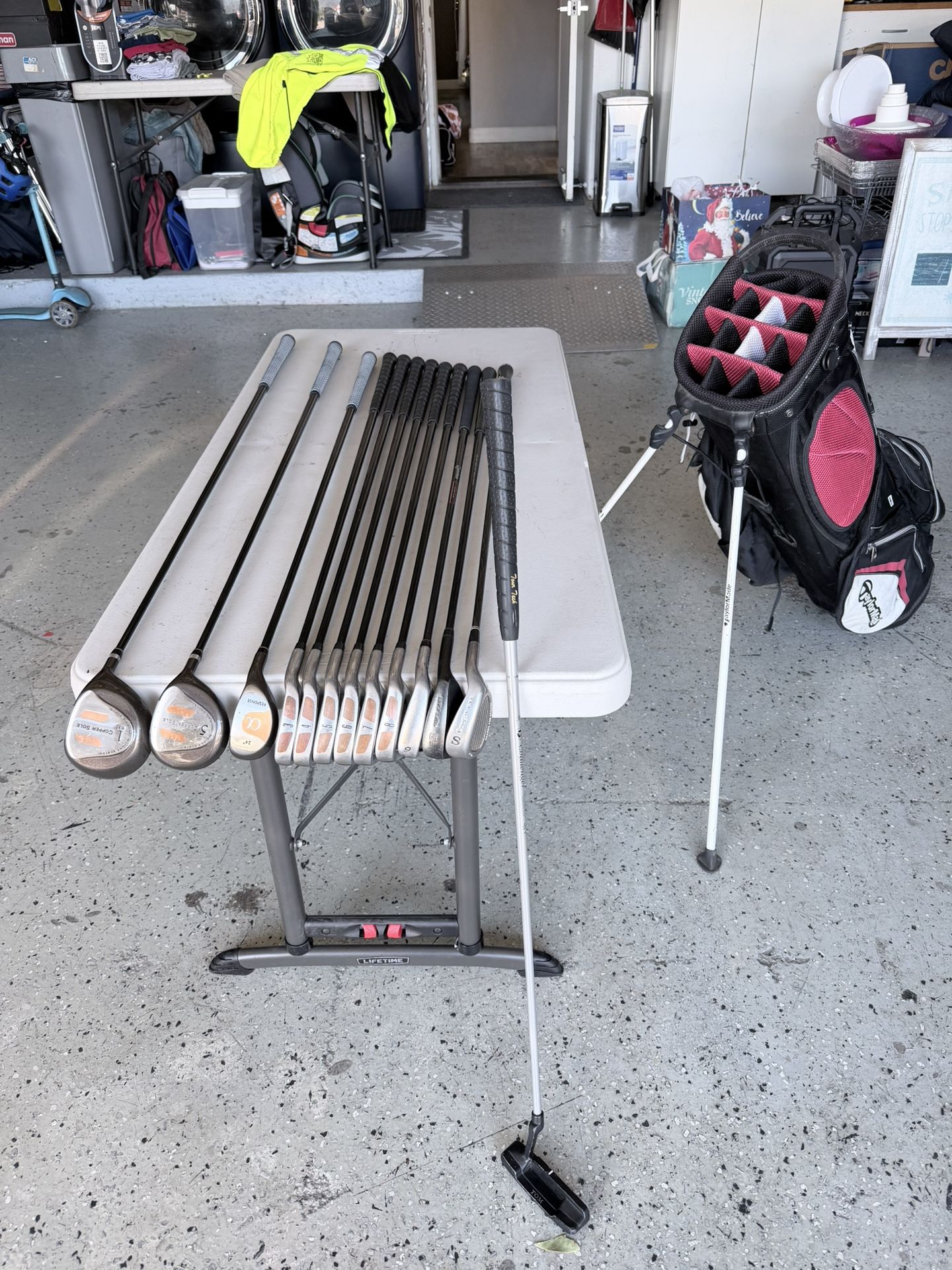 Men’s standard right handed golf club set and Taylormade stand bag.