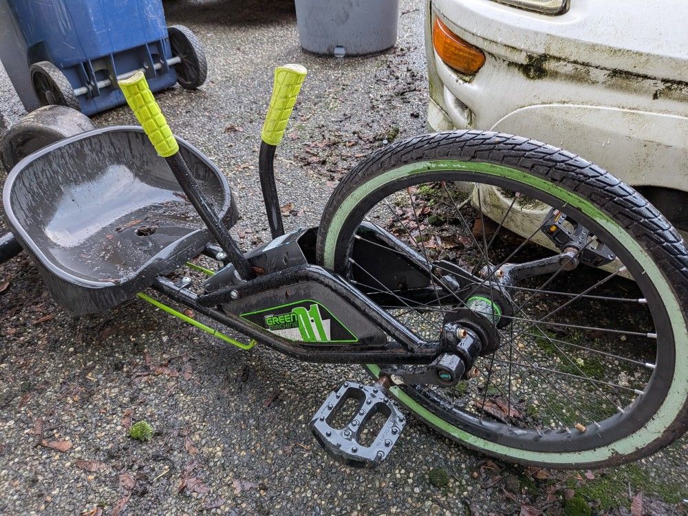 Giving away a used Huffy Green Machine drift trike. It has been well-loved and stored outside, so it shows some weathering and surface wear (as seen in the photos), but it is still fully functional and ready for more spins. This is the larger 20-inch model, which is much sturdier than the junior versions and is designed for older kids and teens who want to do 180-degree drifts and slides. Product Details: Size: 20" front pneumatic tire with extra-wide rear "Super Slider" wheels. Steering: Dual-stick joy-stick steering for complete control over spins and drifts. Braking: Features a front coaster brake (pedal backwards to stop). Adjustable: The bucket seat can be adjusted to different lengths to fit the rider. Rider Specs: Best for ages 8 and up; supports a maximum weight of 180 lbs. Condition: Functional: Pedals, steering, and frame are all in working order. Appearance: Significant fading and some rust/wear from being outdoors. It's a "mechanic's special" or a great project for a quick cleanup. Price: FREE – first person to come get it takes it!