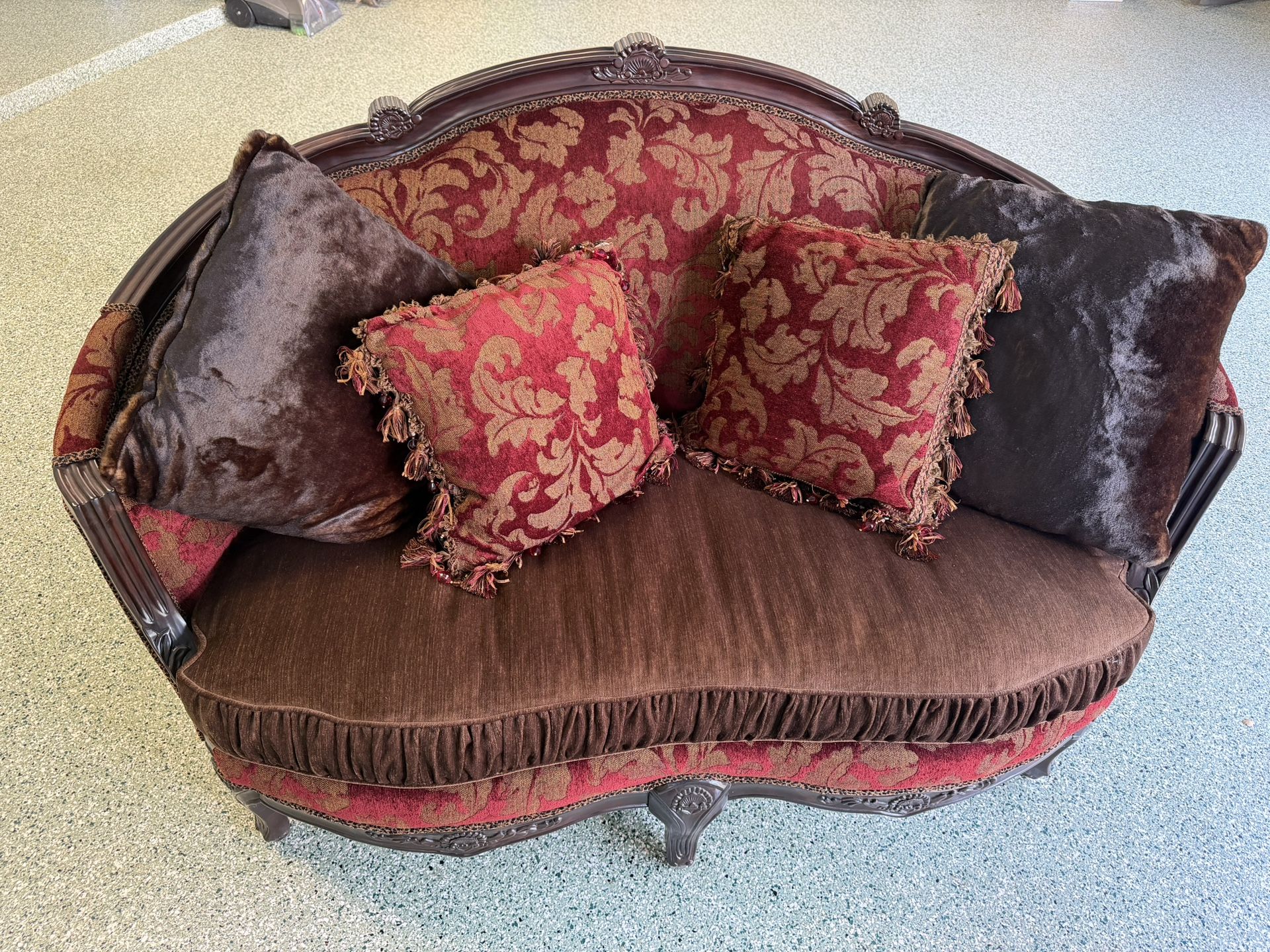 Beautiful love seat measures 64” wide by 36” deep by almost 40” high in the back. Pillows come with it. No tears, spills, etc. Like new.