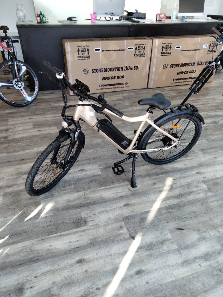Brand new electric bike with one year warranty. 500 watt electric mountain bike with dual USB ports and a 14 amp hour Panasonic battery. Visit Stone Mountain Bike Company online or in store to get yours today!