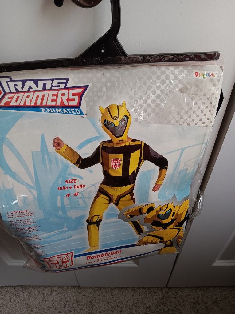 Brand new Bumble Bee Transformer coustume. New in package has never been worn retails for $29.99. It has a plastic mask that is included with the coustume. The size is a 4-6.. The brand is Disguise.The package has a tear, but there is nothing wrong with the coustume I'm asking for $18.00 or best offer.