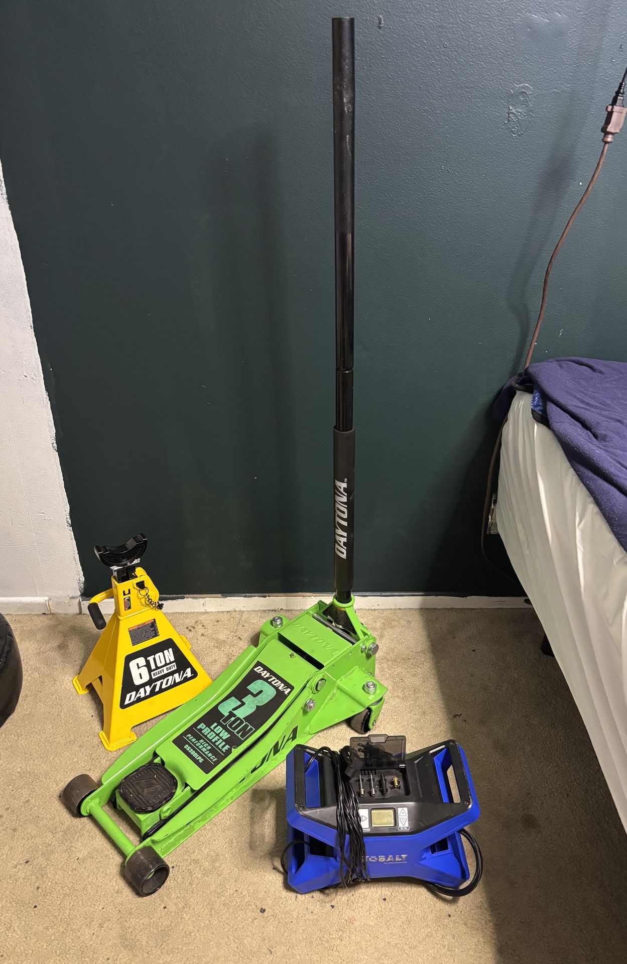 FLOOR JACK, STAND & AIR COMPRESSOR