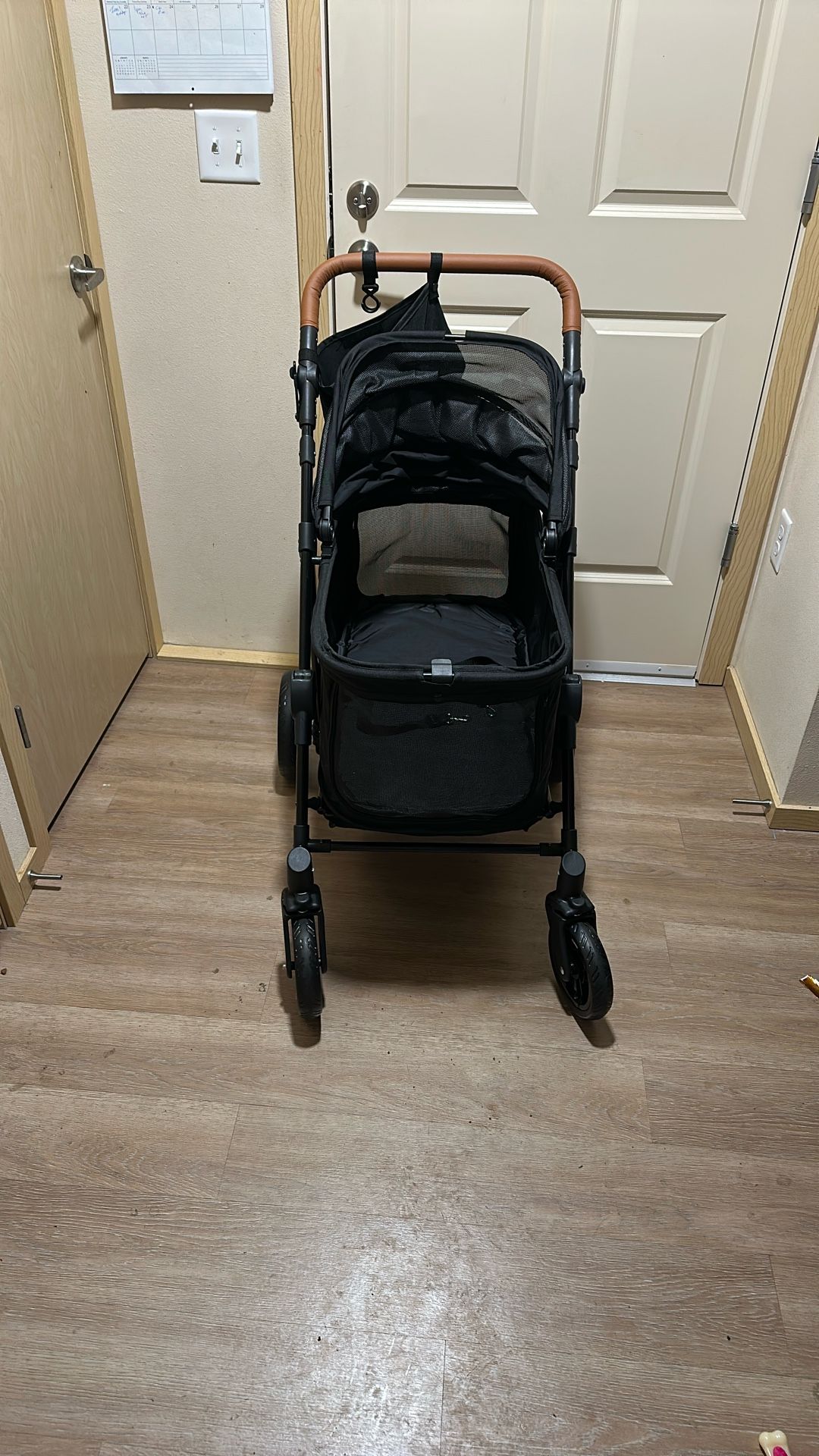 Medium dog stroller holds up to 66 pounds has big wheels that work great the brakes work the top locks I only used it twice so it’s brand new I paid 150 for it off of Amazon selling only for 75 great deal for you
