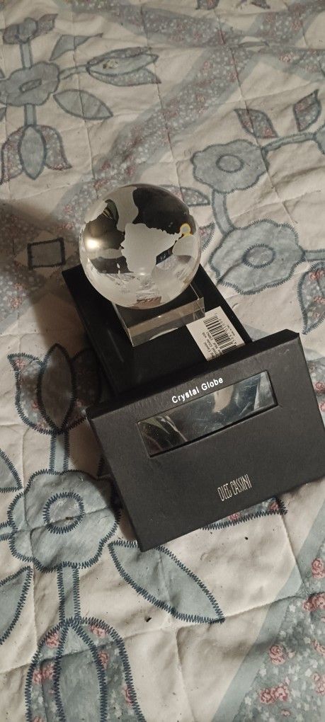 This beautiful, high-quality clear crystal globe is a sophisticated desk accessory or decorative item. It rests on a rectangular crystal base and comes packaged in its original sleek black presentation box, complete with a white satin interior lining. Features: Clear, sparkling crystal design Globe detail etched into the crystal Sturdy crystal base Original branded gift box included Ideal for: A luxurious gift, an elegant office paperweight, o 9r a collectible item for crystal enthusiasts.