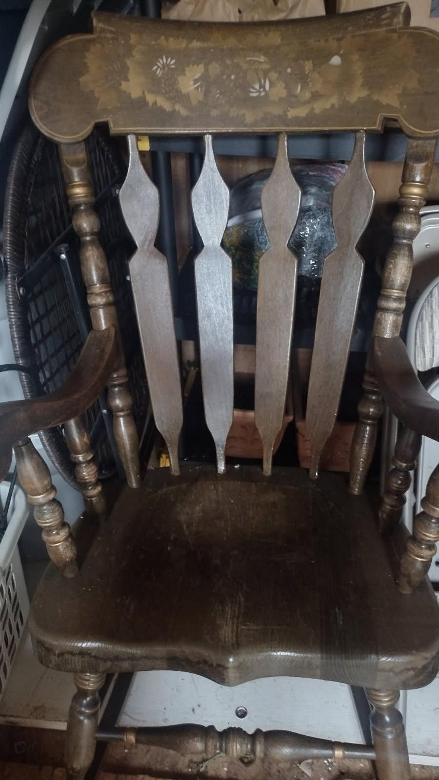 This chair is very heavy well made. Could be a project. Could be beautiful. I have no space for it hate to see it go. Offers welcome