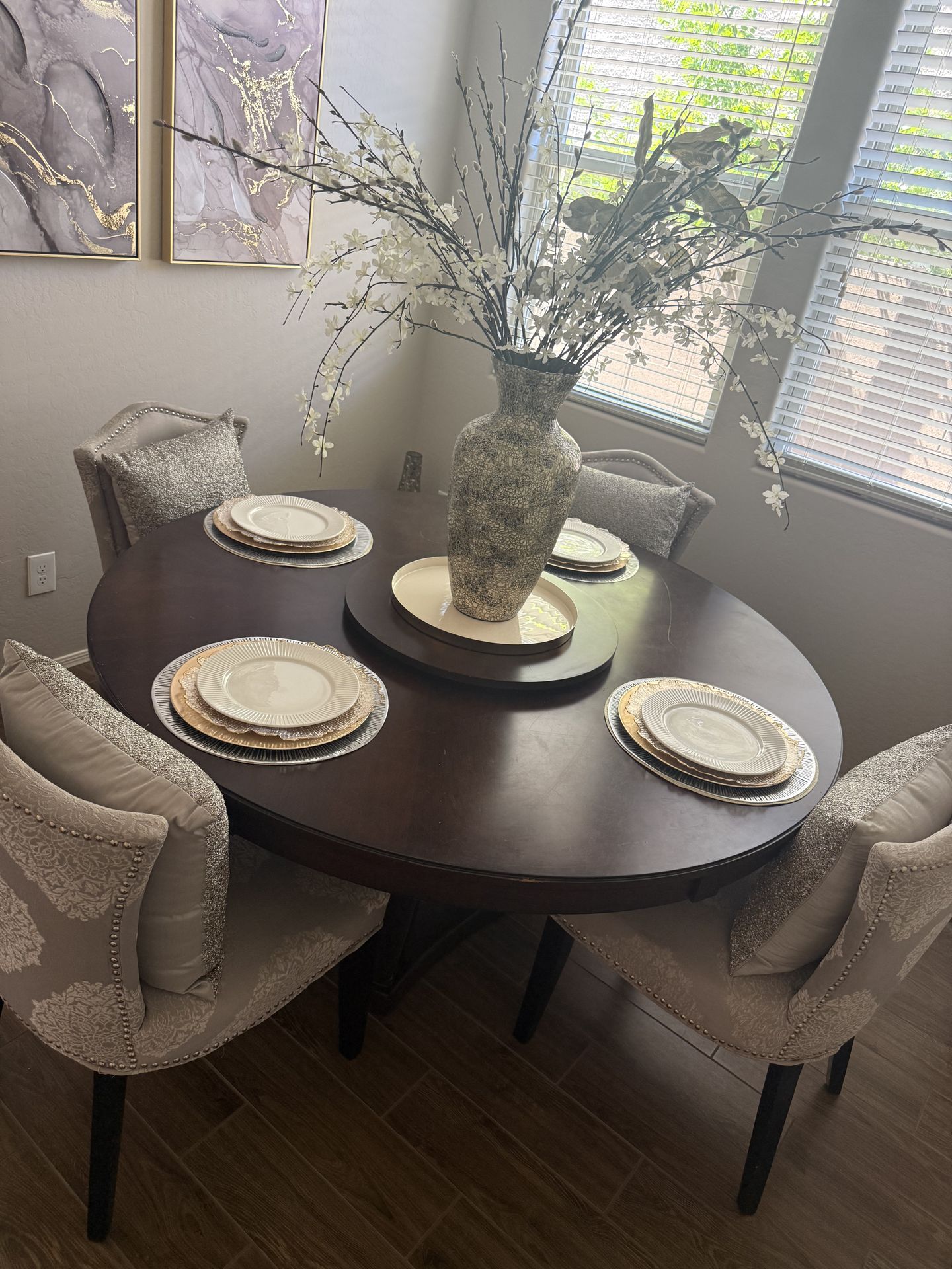 Asking $200 for all-table and four chairs. A bit oversized table is about a 5 foot radius and chairs are about 1 1/2 feet from the ground to the seat.  no tears in the chairs, but could be cleaned no major stains some scratches and wear and tear on table but nothing major OBO $100 - 4 chairs ($25 each) $100 - Table