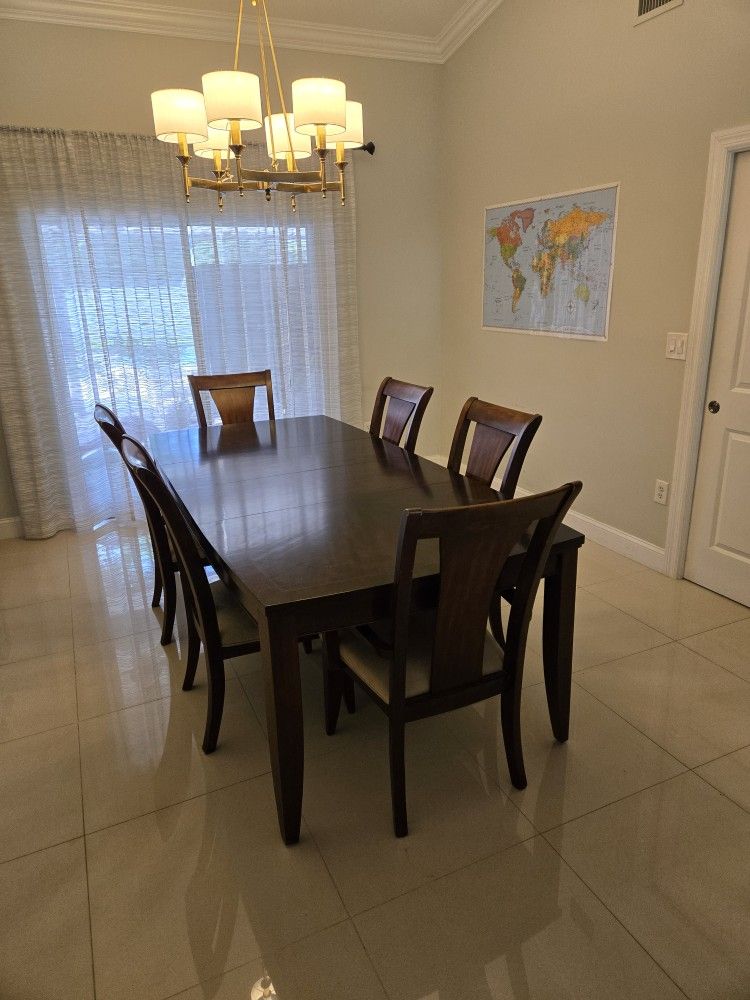 Real wood dining set with two removable extension leaves. End chairs have arm rests. Set purchased at Macy's Furniture Store. Delivery available.
