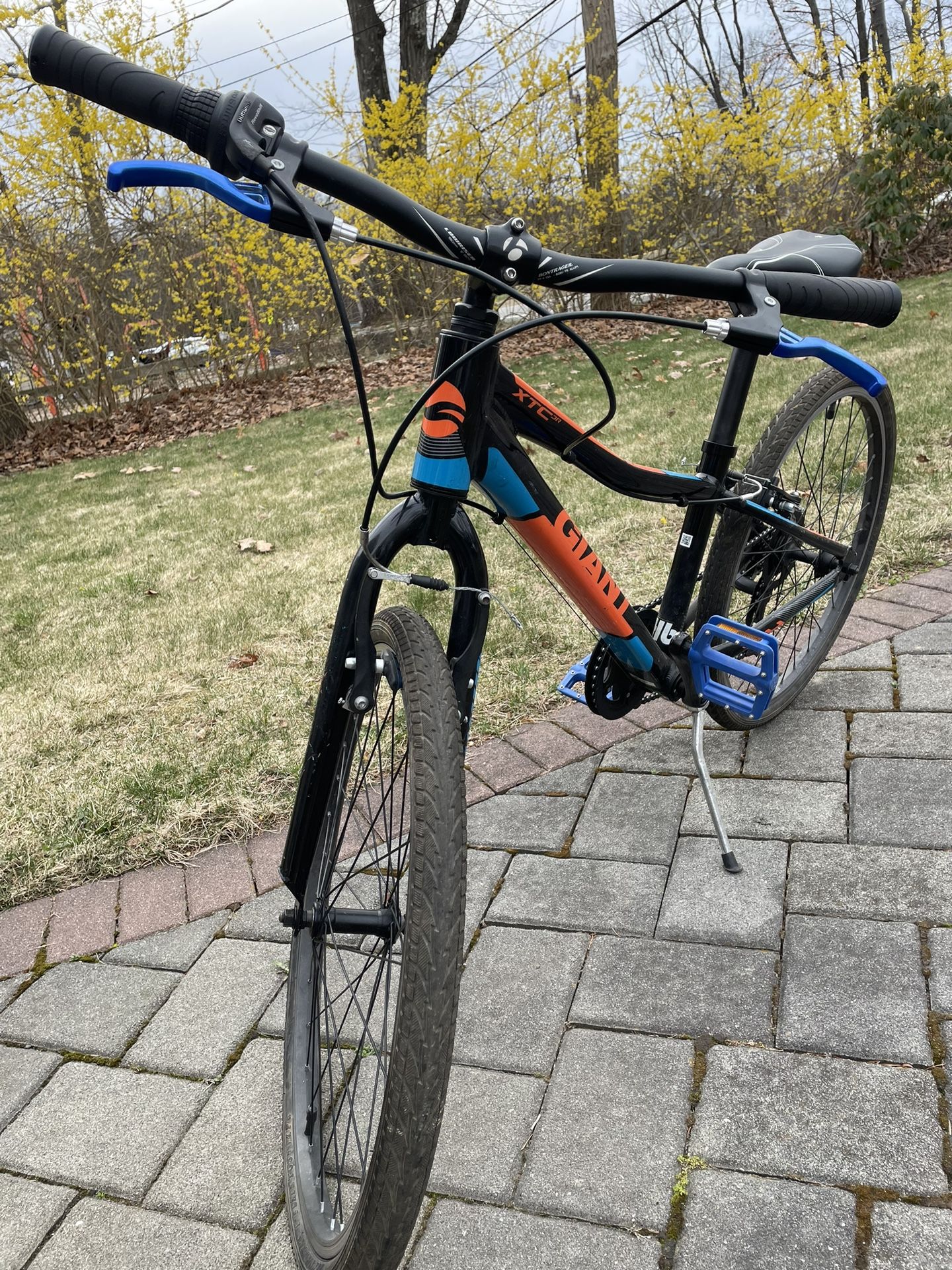 24" wheels, frame size 10". Aluminum frame no rust shape is in normal use. Tires, Brakes, Grips, Saddle, Handlebars, Pedals, Kickstand All in great condition. The bike is 7 speed, shift smooth. It is used and has scratches.